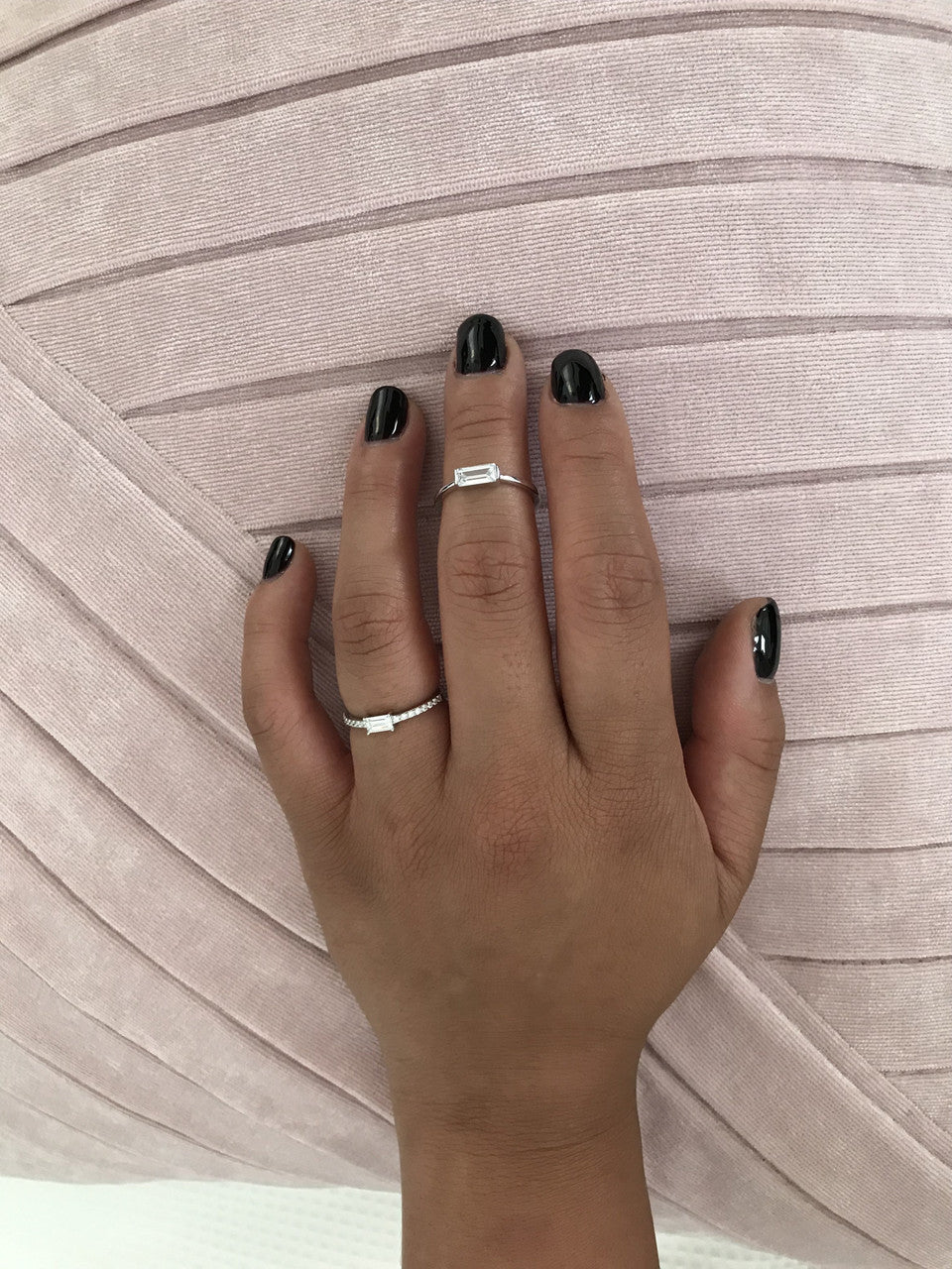 Sweet Mika is the sweetest ring! Featuring a stunning single baguette and a half set pave band the Mika ring is perfect on its own or wear it stacked with other Georgini rings.