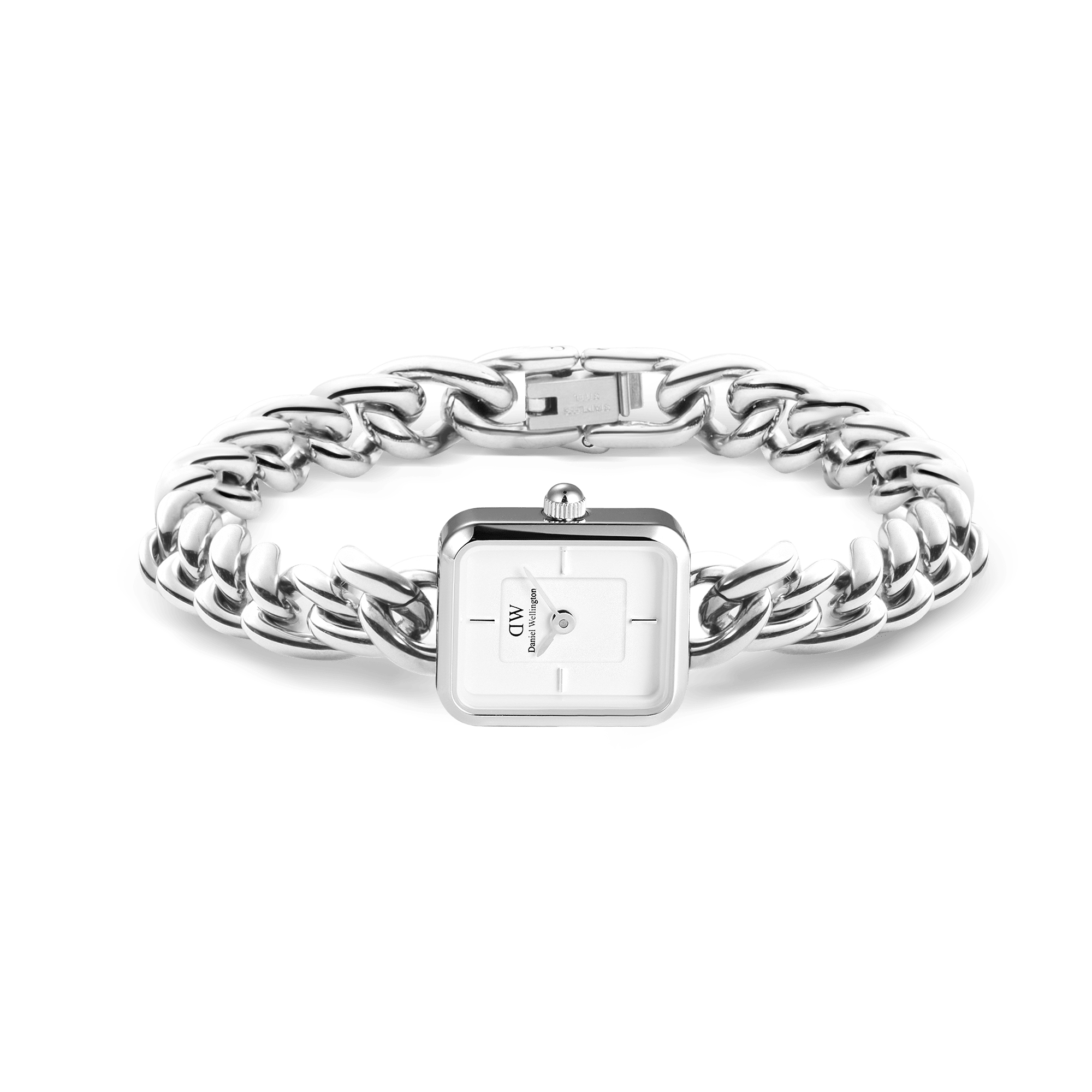 The Jolie chain watch — a timeless blend of the Quadro mini watch head and a Chain jewelry bracelet. The small watch head seamlessly integrates with the chunky chain, creating a functional yet decorative piece. Adjustable chain links ensure a perfect fit for any wrist size.