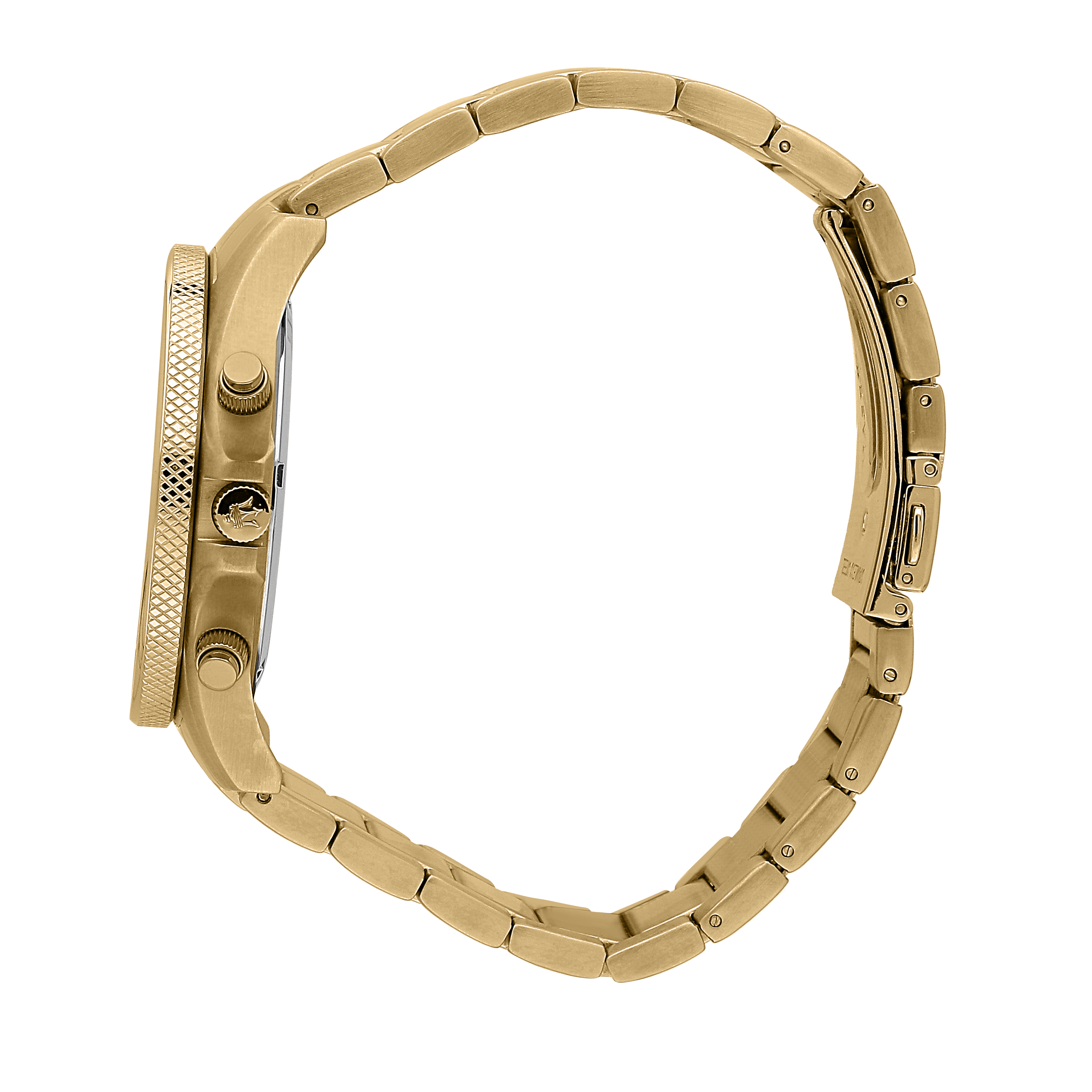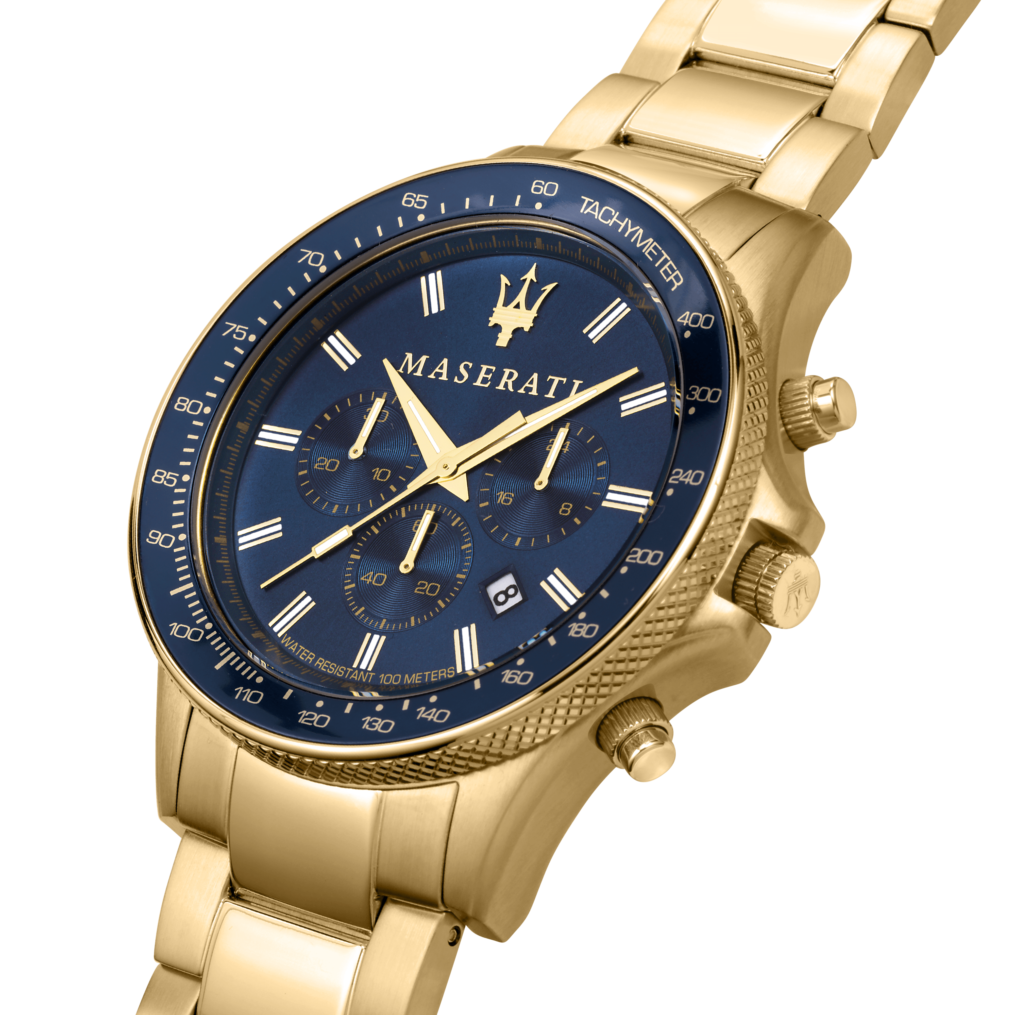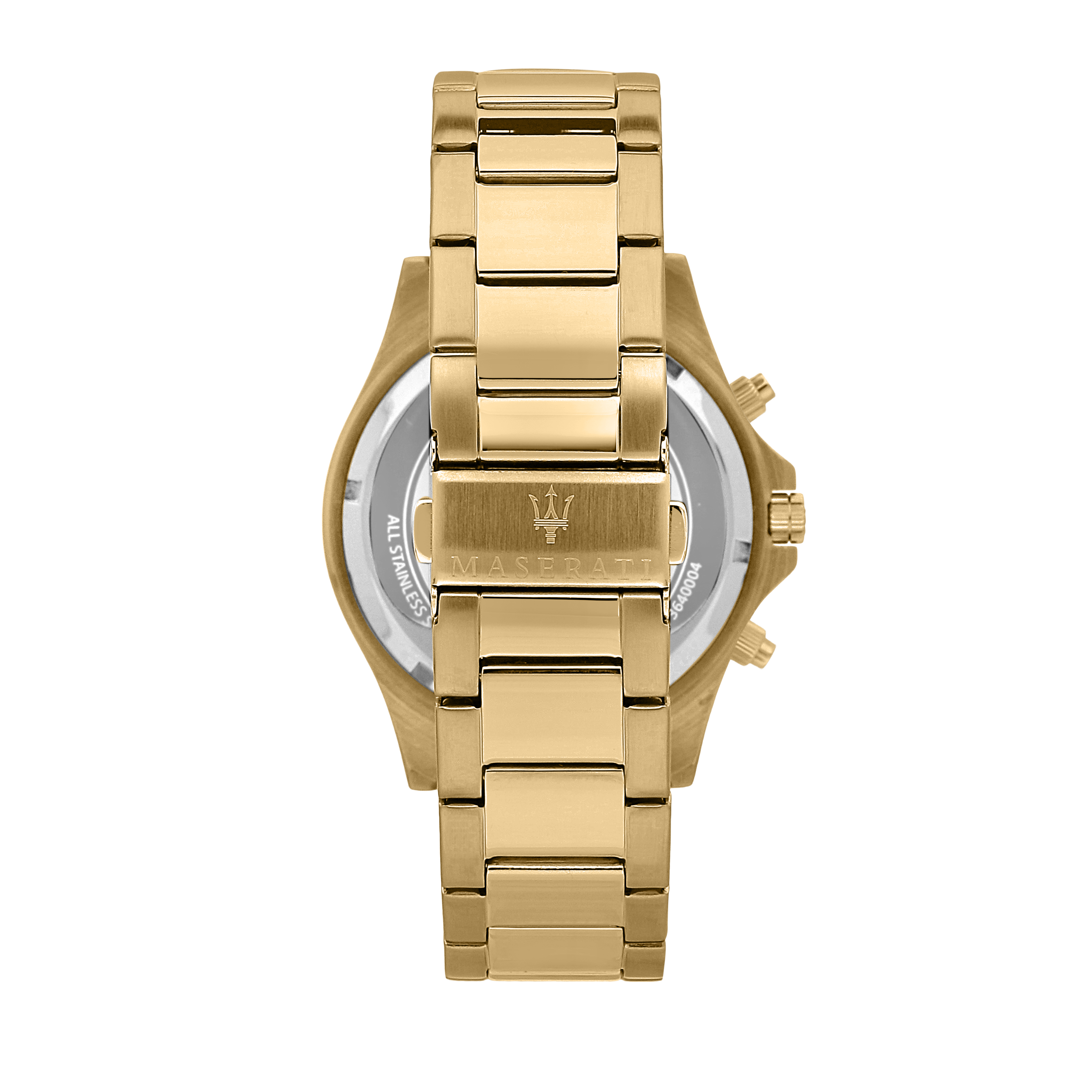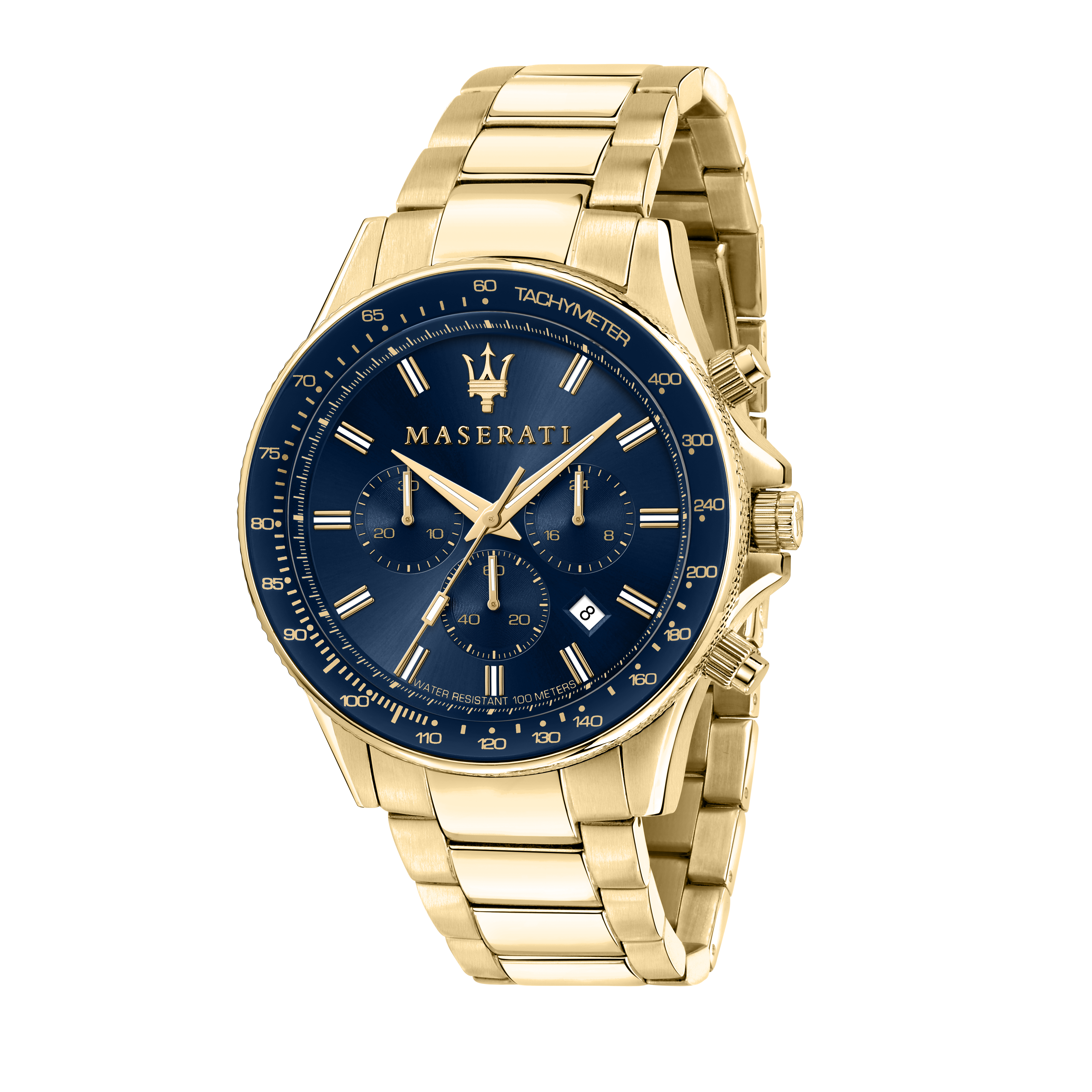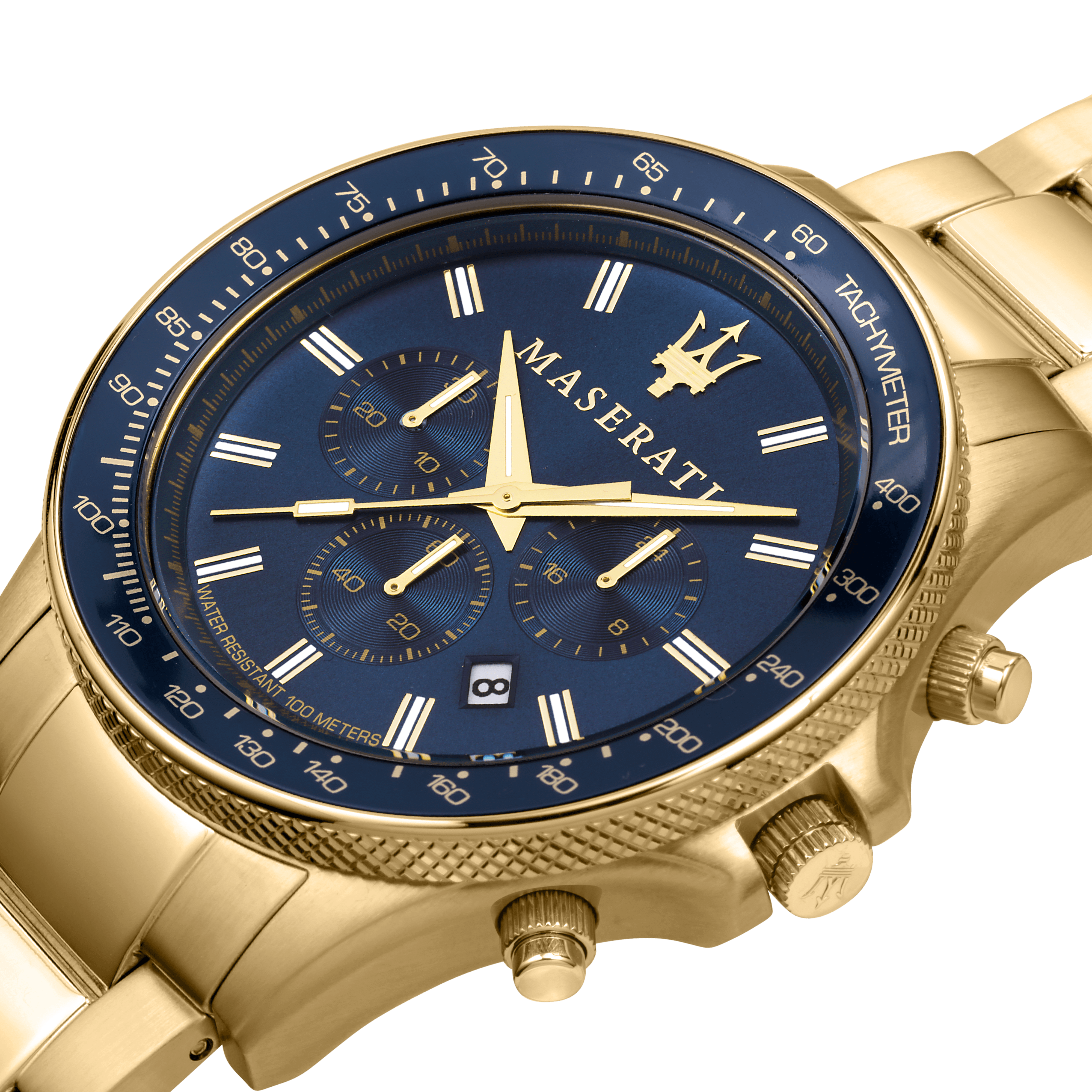 Presenting the Maserati Sfida 44mm Gold Chronograph Watch. The Maserati Sfida Collection consists of watches with sporty elegance, characterized by a structured design, steel case (44mm) with rotating or tachymeter bezel, knurling finish on one side. The sunray effect or modern dégradé dials offer elegance and rigour, distinctive features of Maserati maison. The new models from Sfida collection are based on Maserati's values and sporting heritage. Detailed watch constructions and colour nuances enhance the super luxury brand DNA.