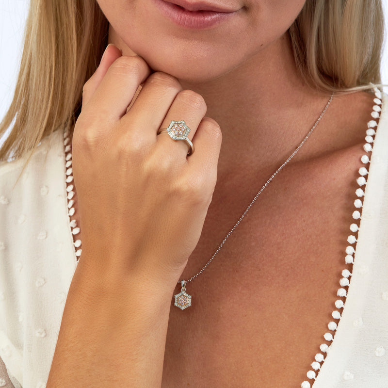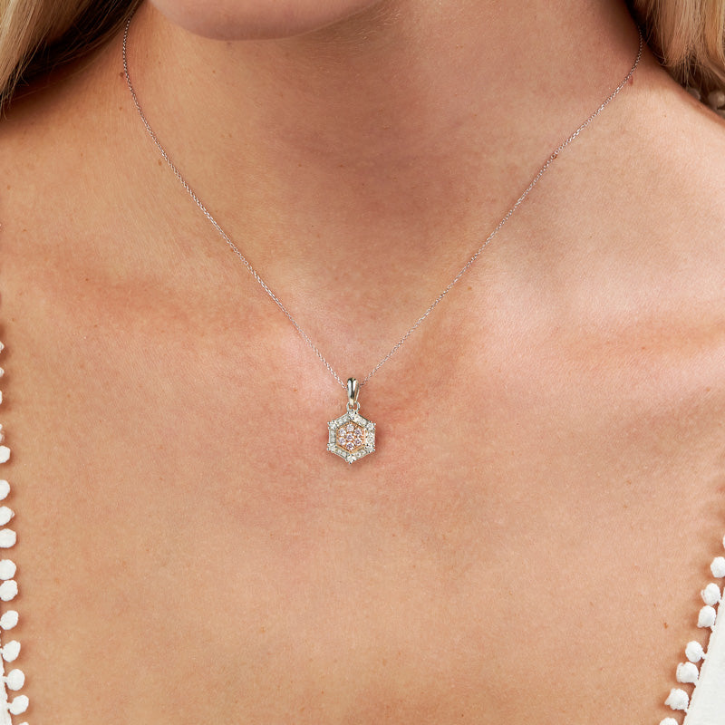 A beautiful blend of natural Australian Argyle pink diamonds with fine white diamonds. Crafted in 18ct rose and white gold.