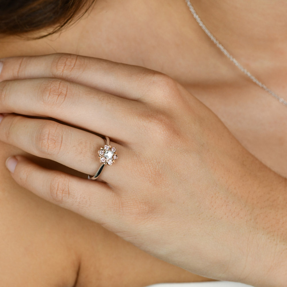 This unique piece features a single white diamond surrounded by a floral halo of exquisite Argyle pink diamonds set in 18ct rose gold.