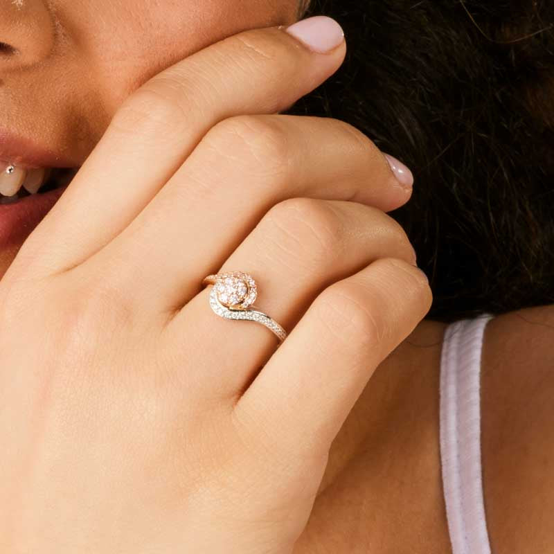 Featuring a contemporary twist on the classic halo design, our Blush Reese Ring features a cluster of Argyle pink diamonds haloed by sparkling pink and white diamonds in a unique twist setting. Crafted in 18ct Rose and White Gold, a durable and long lasting metal, this intricate ring makes for the perfect, one-of-a-kind engagement ring.