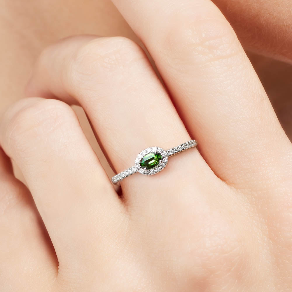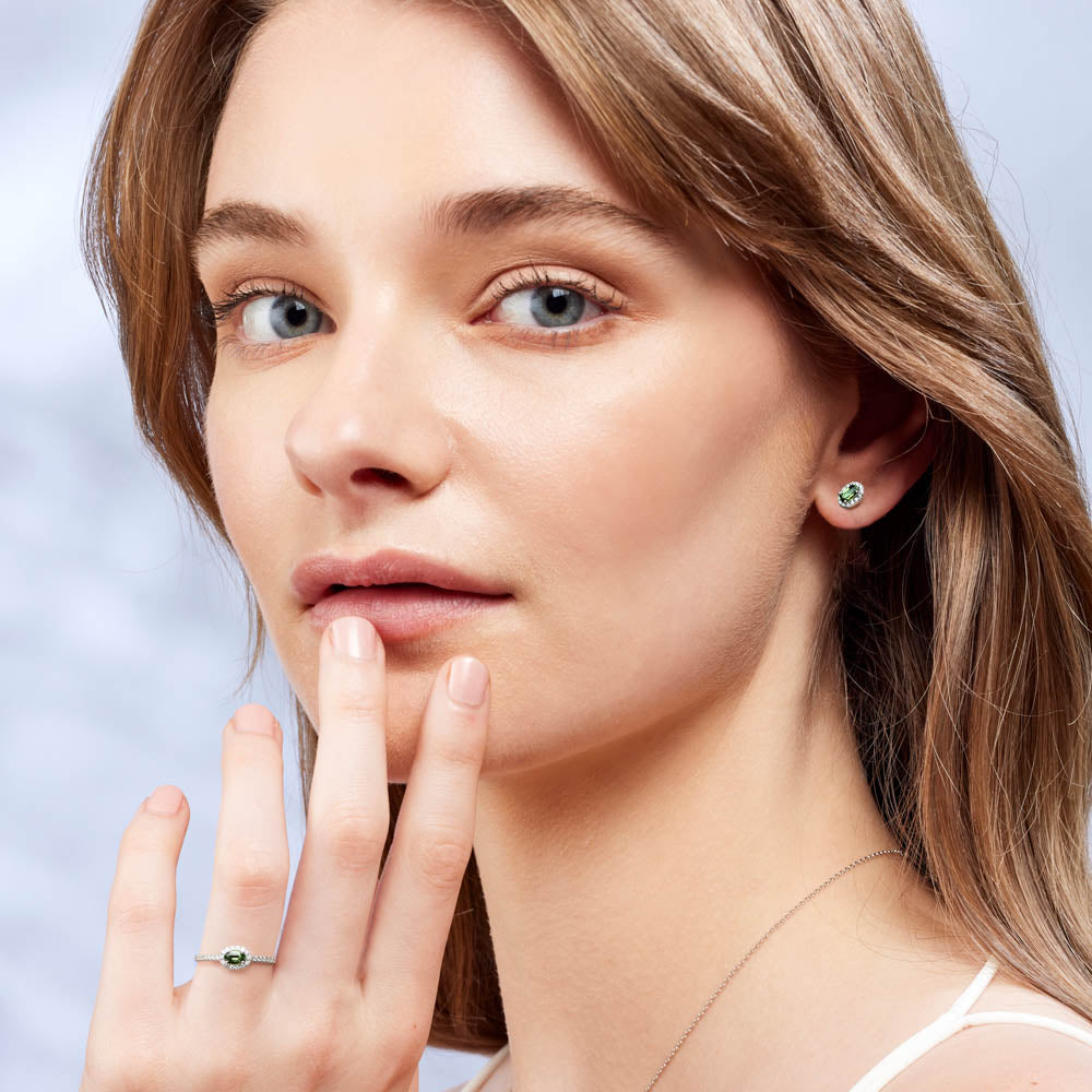 The epitome of true luxury, Clarissa features a spectacular oval shaped Green Australian Sapphire haloed by dazzling round white diamonds and set on a diamond covered band. Set in 18ct White Gold, a durable and long lasting precious metal.