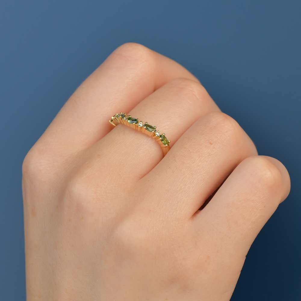 The perfect pairing for any engagement ring or stylish pop of colour, this curved band features interchanging diamonds and Australian marquise teal sapphires, complimentary to many different stone colours and shapes.