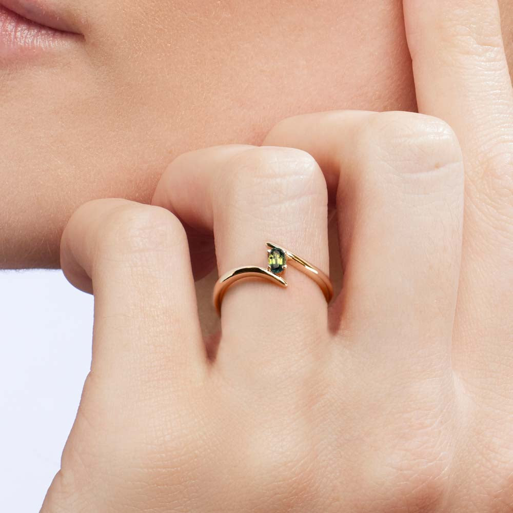 This dainty design is stylish and modern, featuring a gorgeous oval cut Australian Sapphire, the Indee ring is feminine and beautiful. This ring is crafted in 9ct Rose, White or Yellow Gold.