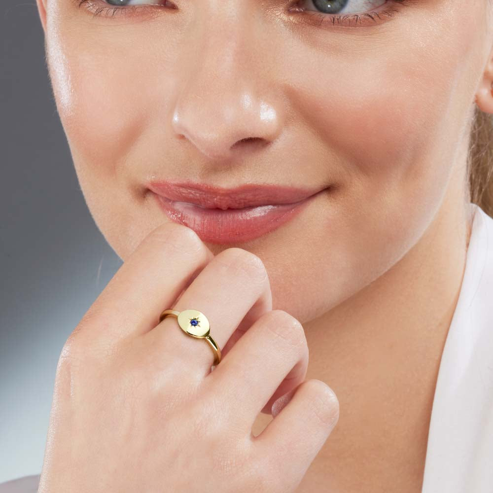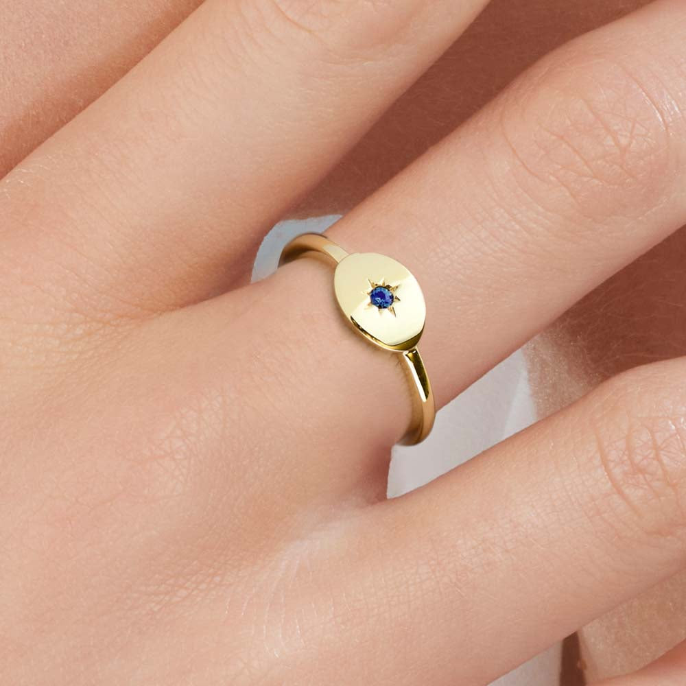 The design of the Maida ring alludes to the signet ring style but with an elegant and delicate twist. The star setting of the Australian Sapphire enhances its colour and saturation. This ring comes in 9ct Rose, White or Yellow Gold.