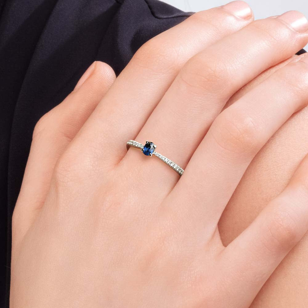 Marisol showcases a gorgeous oval shaped Blue Australian Sapphire, secured by a White Gold claw and set on a diamond covered band. The 18ct White Gold setting, a durable and long lasting metal, makes for a bold and unique design which enhances the gorgeous hues of the Sapphire.