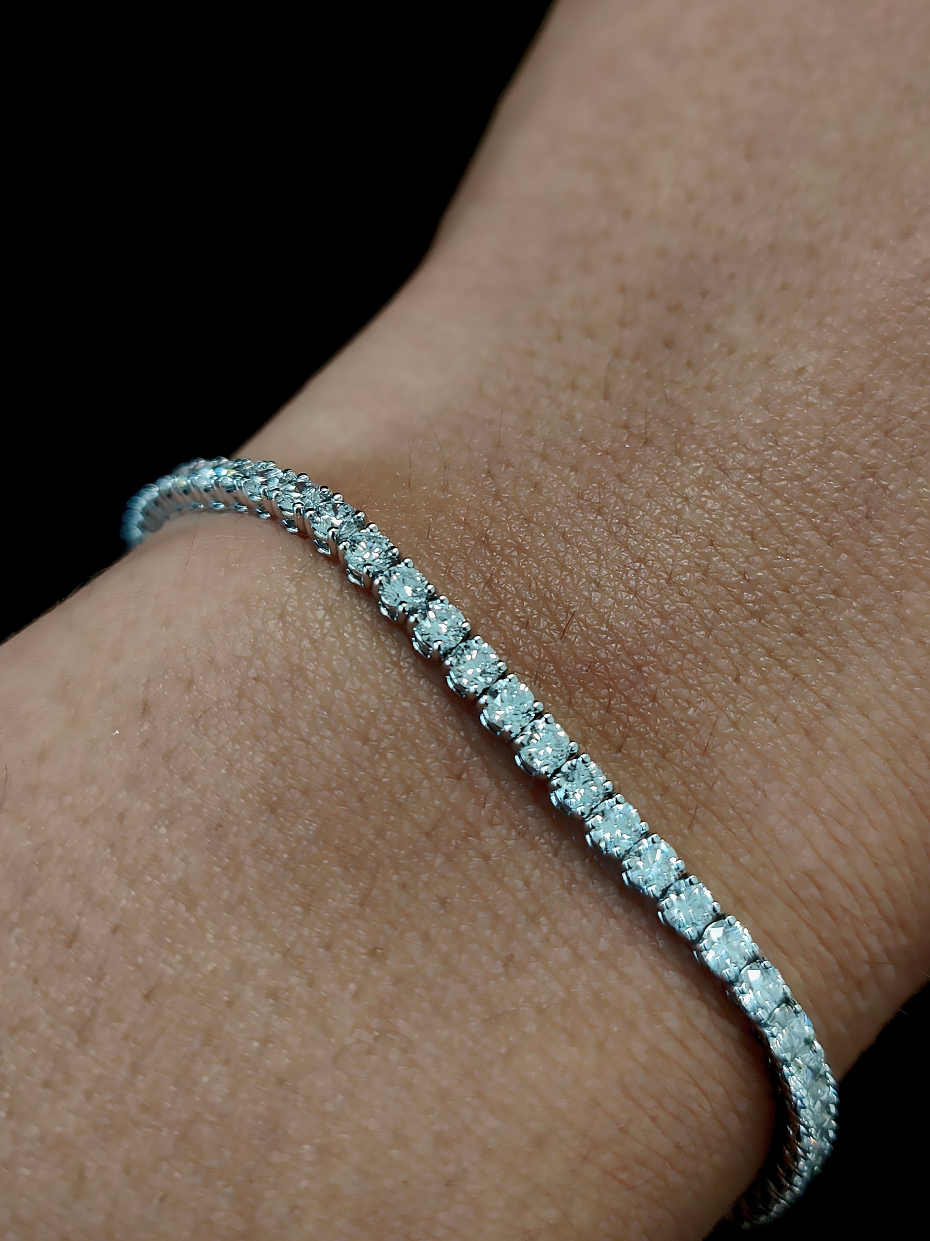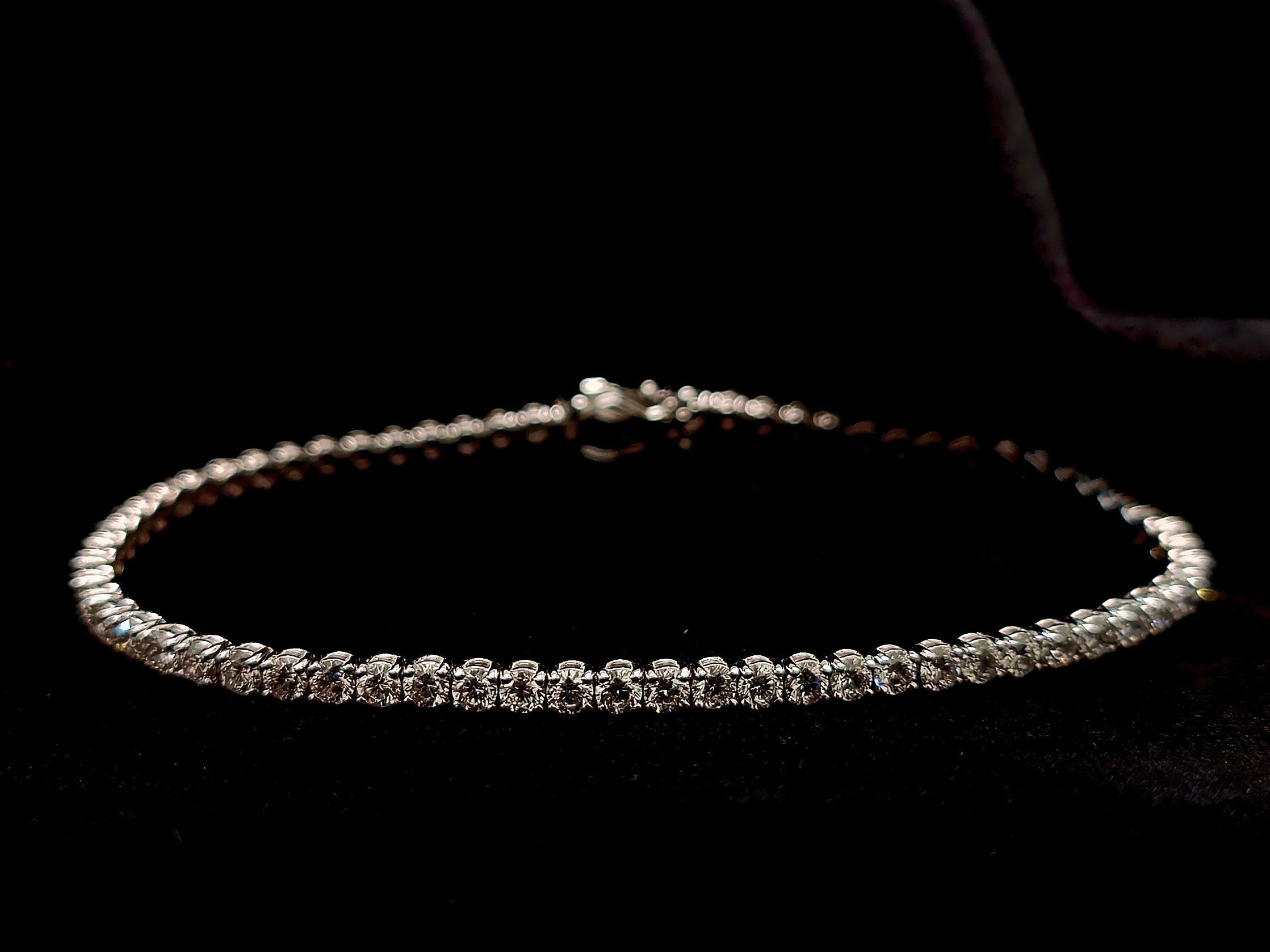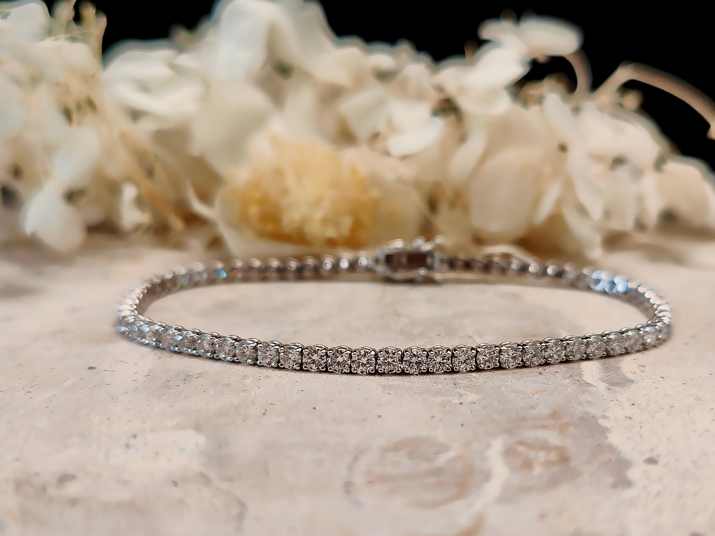 Elevate any outfit with the MJ Sherice Lab Tennis Bracelet. Crafted with 18ct white gold and adorned with lab grown diamonds, this bracelet boasts a stunning 4.49ct total weight. The dazzling D color and VS clarity of the diamonds add a touch of luxury and elegance to any look. A must-have for any jewelry collection!