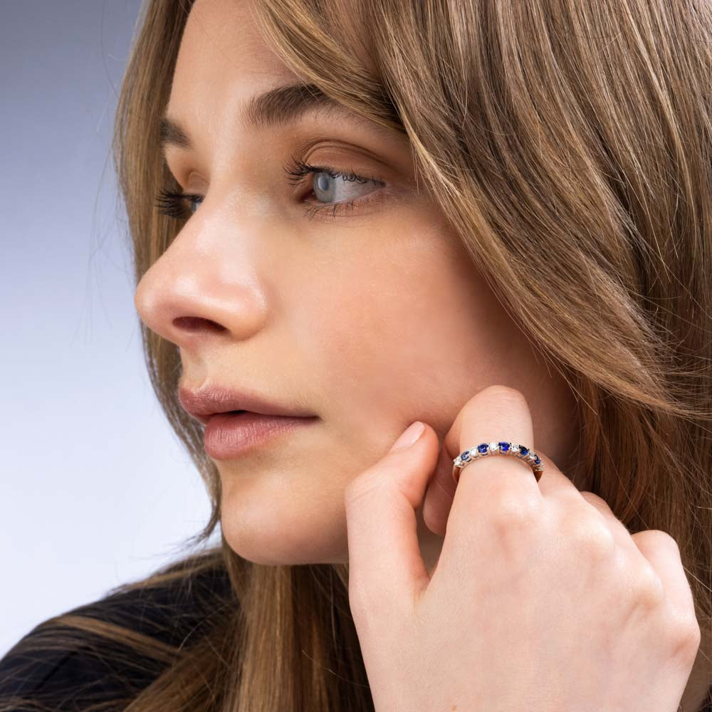 The epitome of elegance and style, Natalia showcases beautiful round cut Blue Australian Sapphires along the 18ct White Gold band, a durable and long lasting precious metal. The natural round cut White Diamonds in between enhances the gorgeous vivid hues of the Sapphire stones, making this stunning piece sparkle and shine throughout.