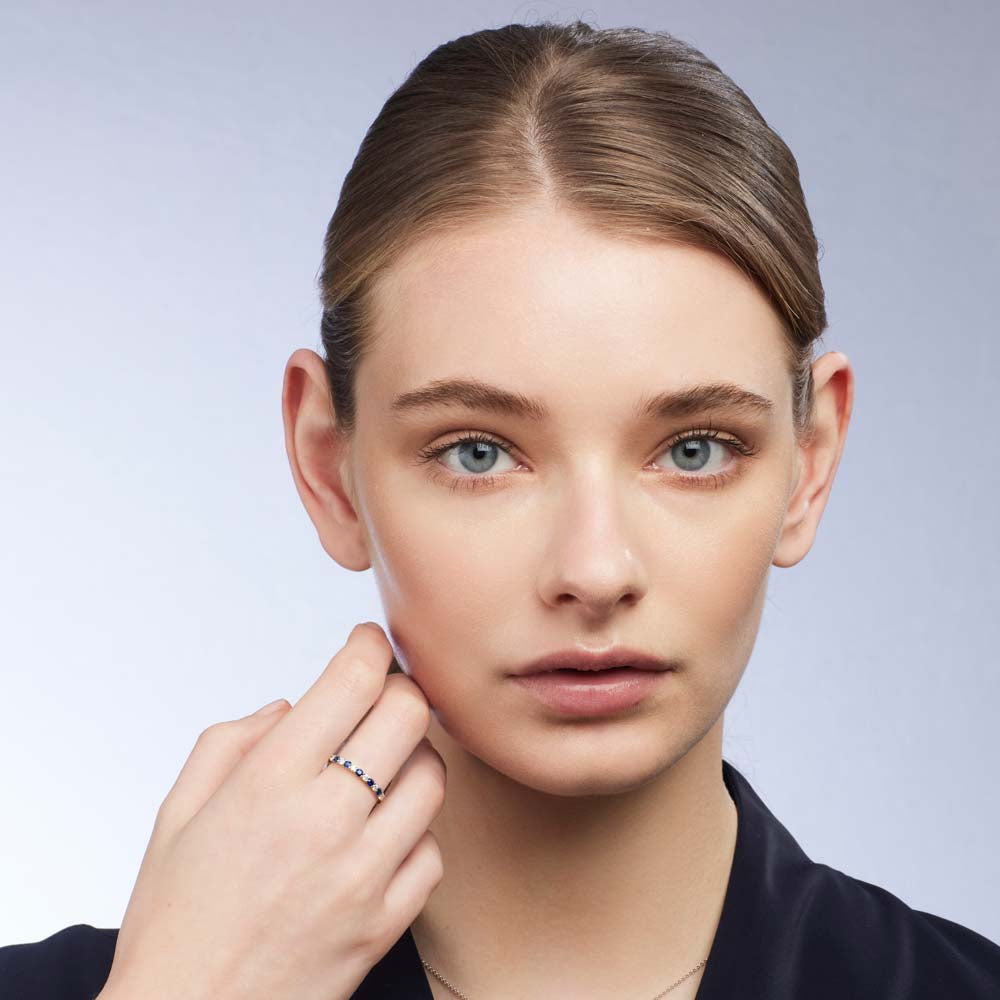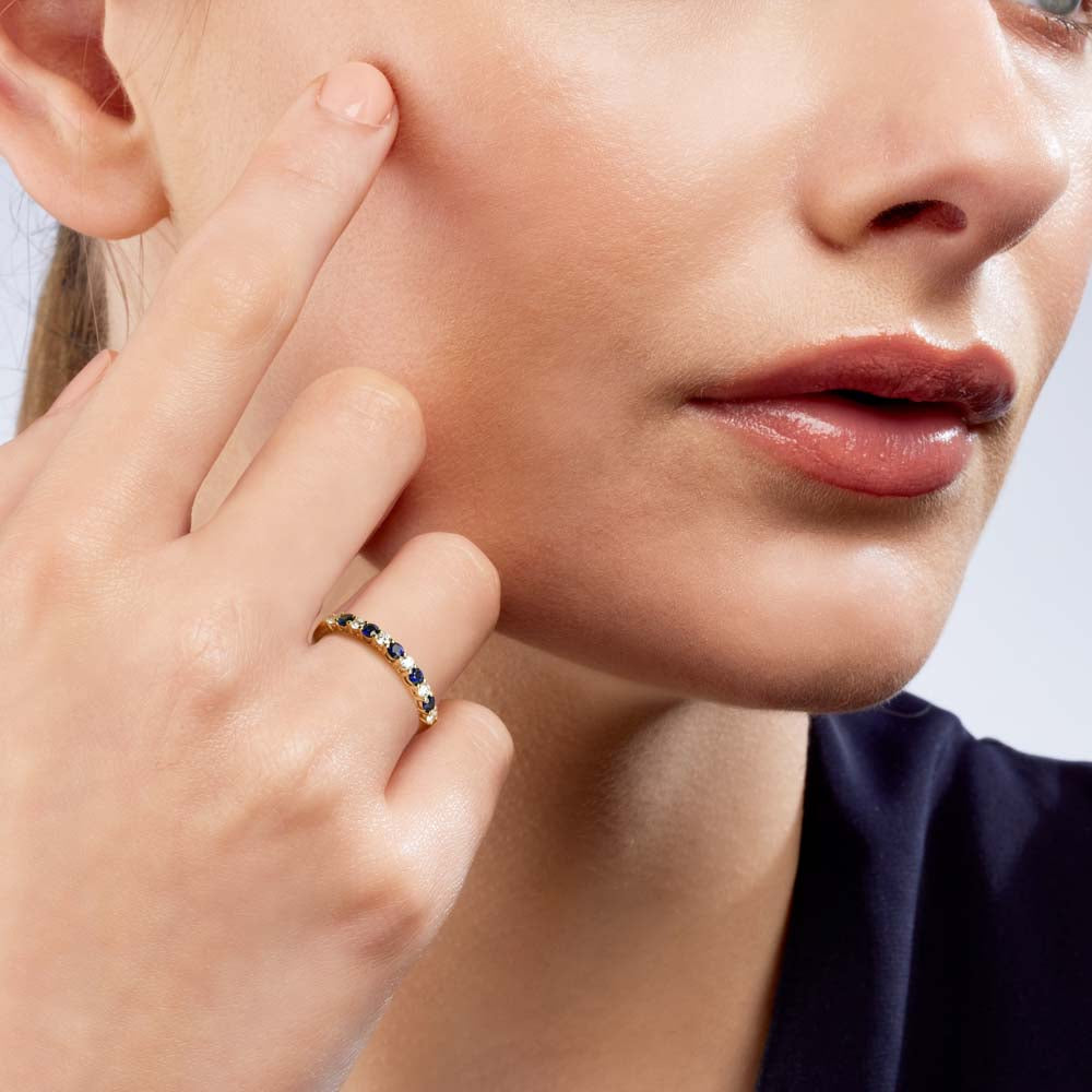 The epitome of elegance and style, Natalia showcases beautiful round cut Blue Australian Sapphires along the 18ct Yellow Gold band, a durable and long lasting precious metal. The natural round cut White Diamonds in between enhances the gorgeous vivid hues of the Sapphire stones, making this stunning piece sparkle and shine throughout.
