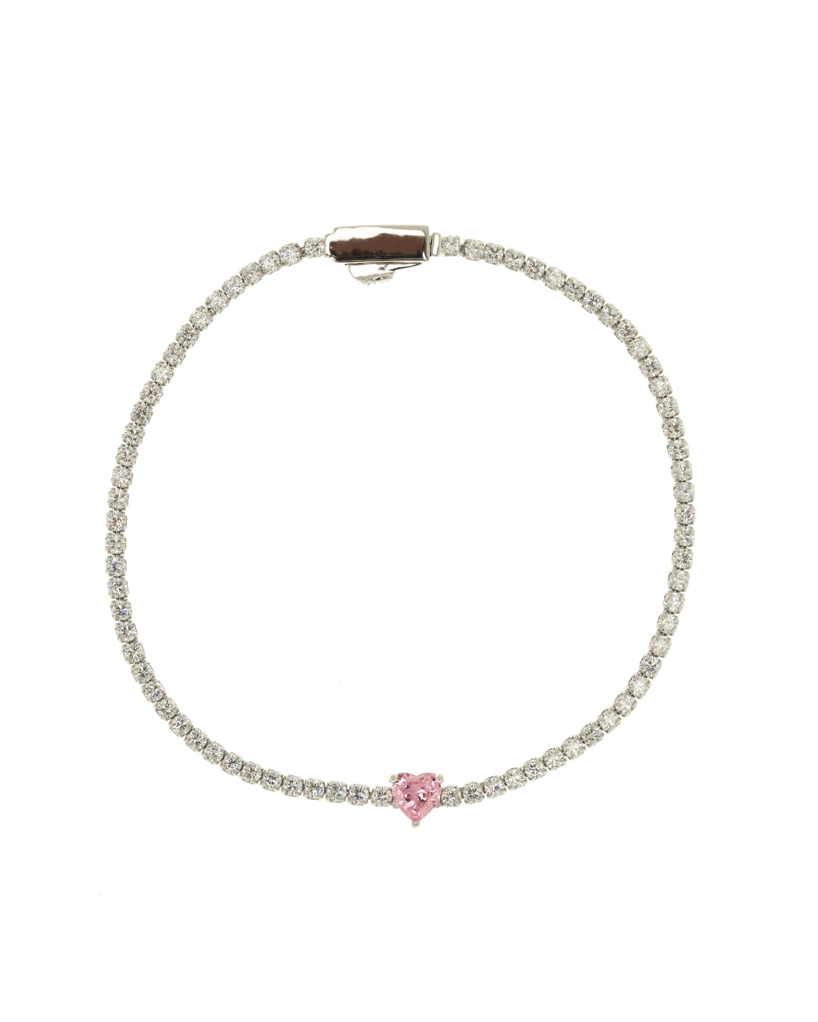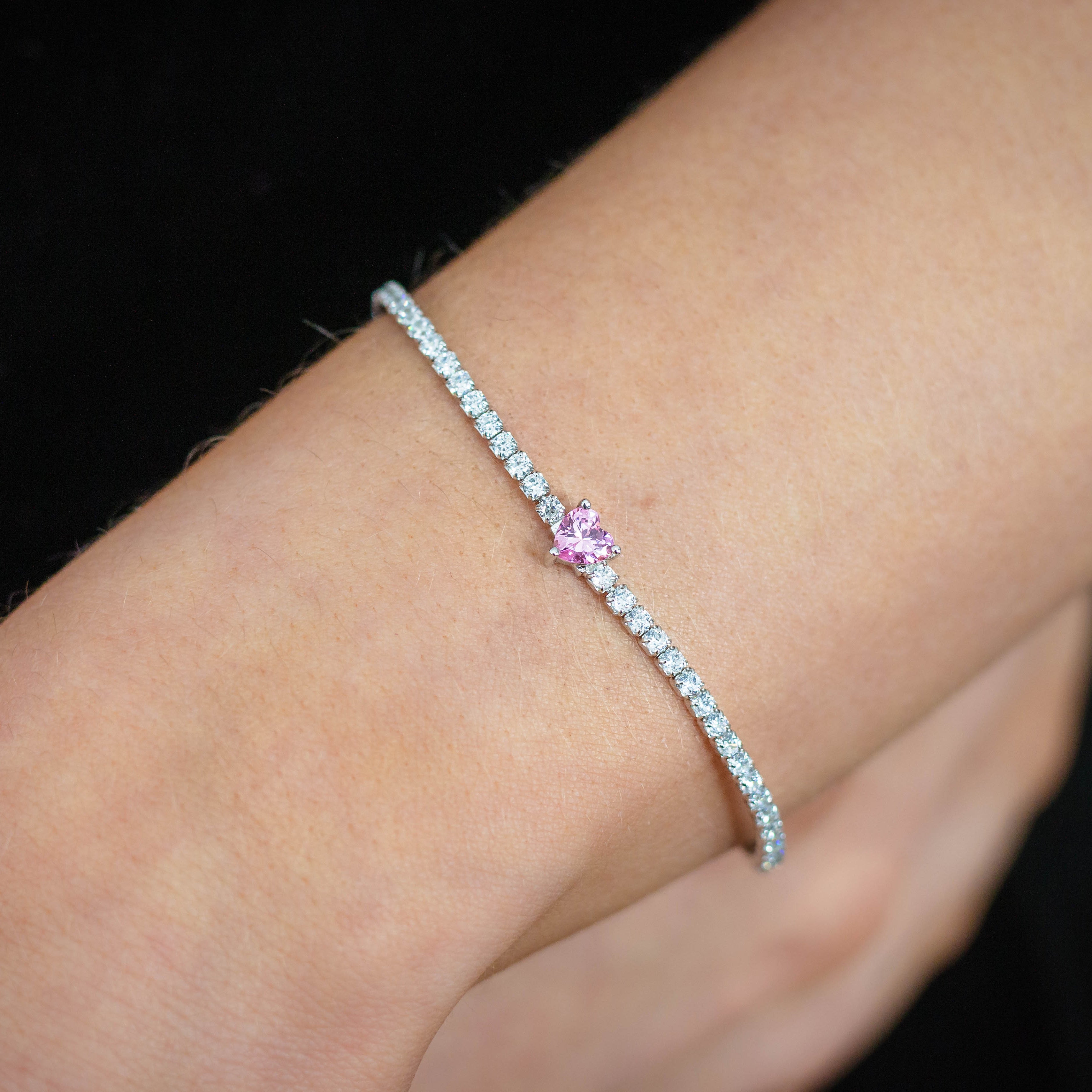 4. **Tennis Bracelet Design:** The timeless tennis bracelet design features a seamless row of glistening stones, providing an unbroken line of sparkle around your wrist. With the addition of the pink heart, this bracelet adds a touch of personality to the classic design, making it perfect for both everyday wear and special occasions.