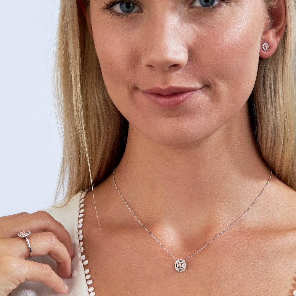The Blush Ariel Necklace features a unique arrangement of pink and white diamonds surrounding a single Argyle pink diamond, placed on a delicate chain.
