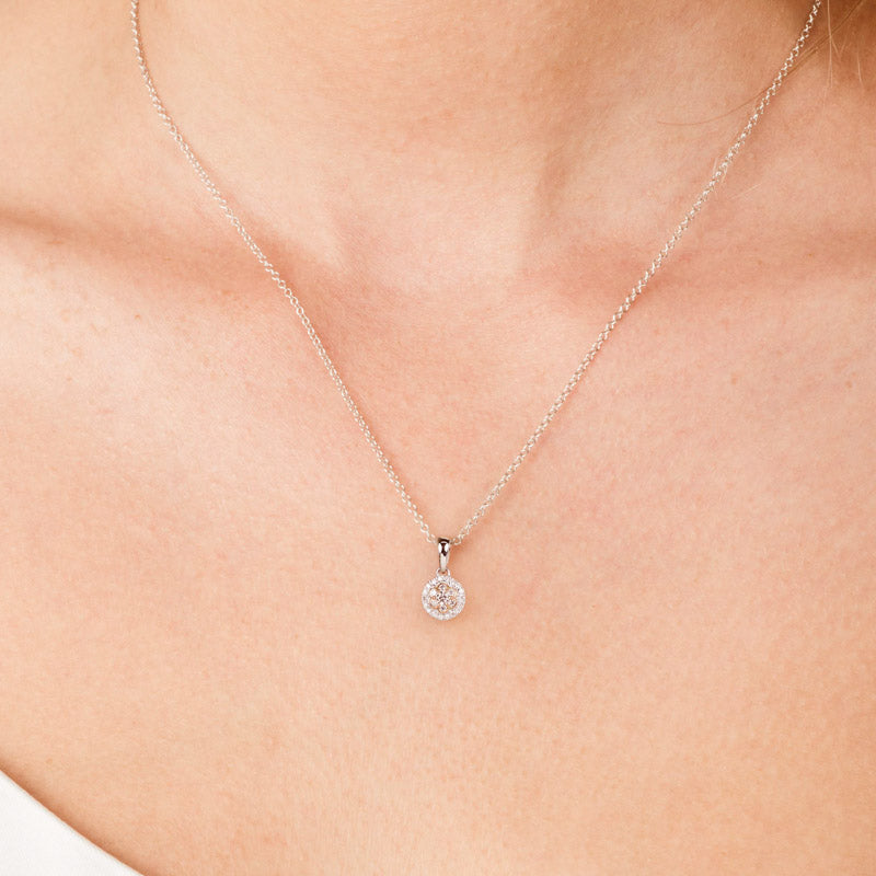 The Blush Delilah Necklace features a stunning arrangement of fancy light pink Argyle diamonds, set within a halo of sparkling white diamonds. Placed on an 18ct white gold chain, this piece is the perfect sparkling accessory.