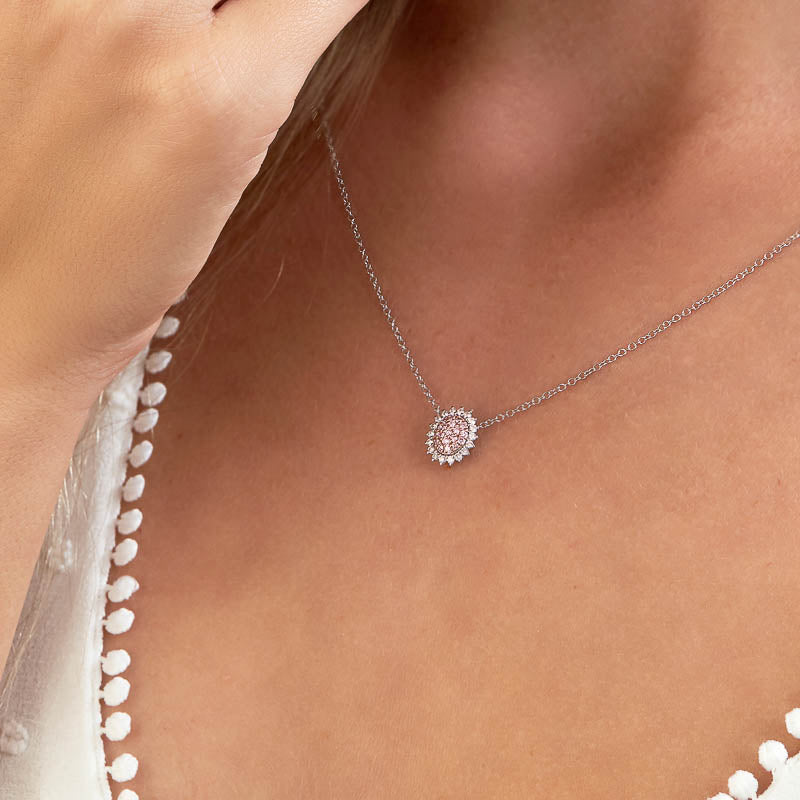 This stunning necklaces featuring a beautiful cluster of pave set Australian Argyle pink diamonds surrounded by a halo of white diamonds. Set in 18ct white and rose gold.