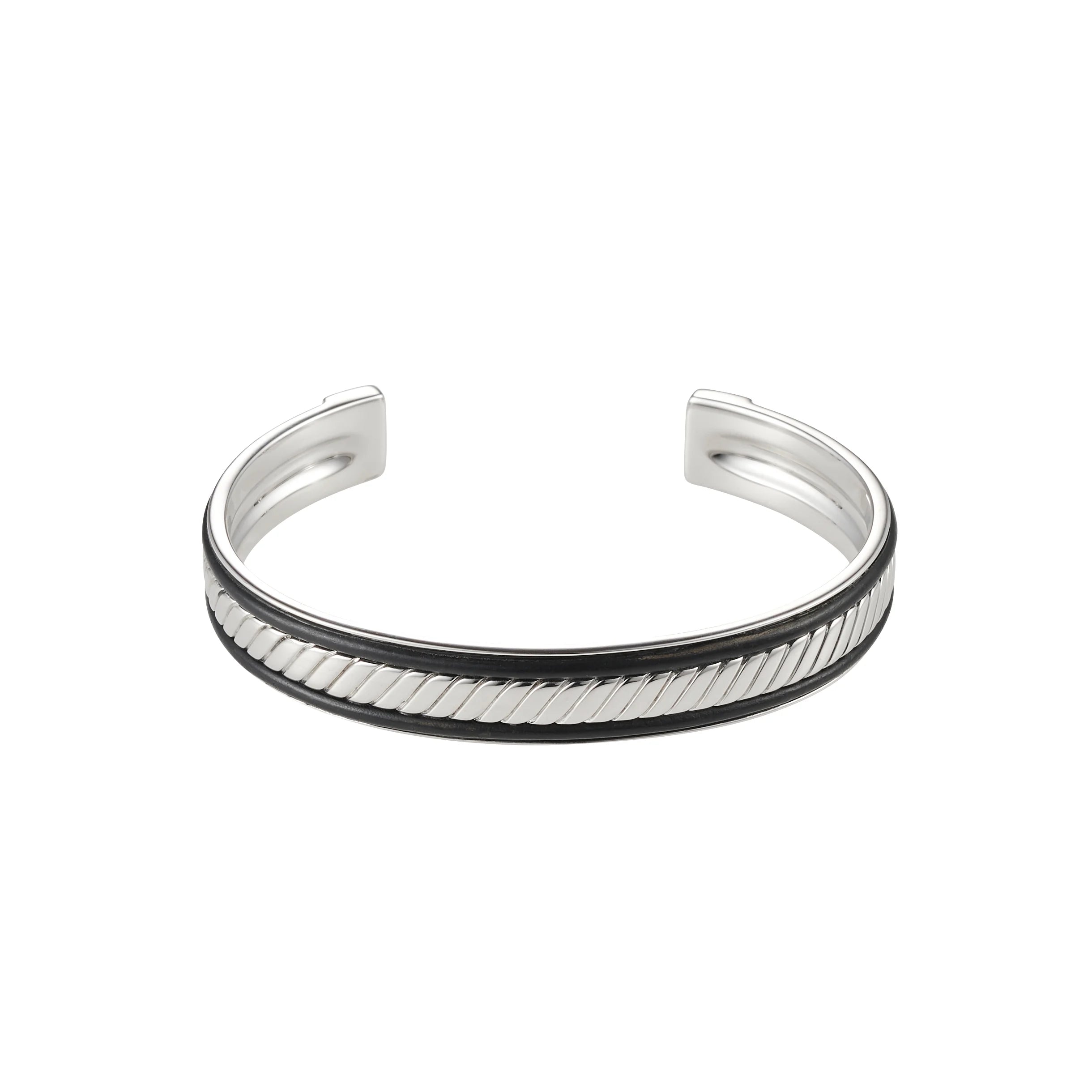 Rhodium Plated Sterling Silver, Leather Trim Cuff/Bangle