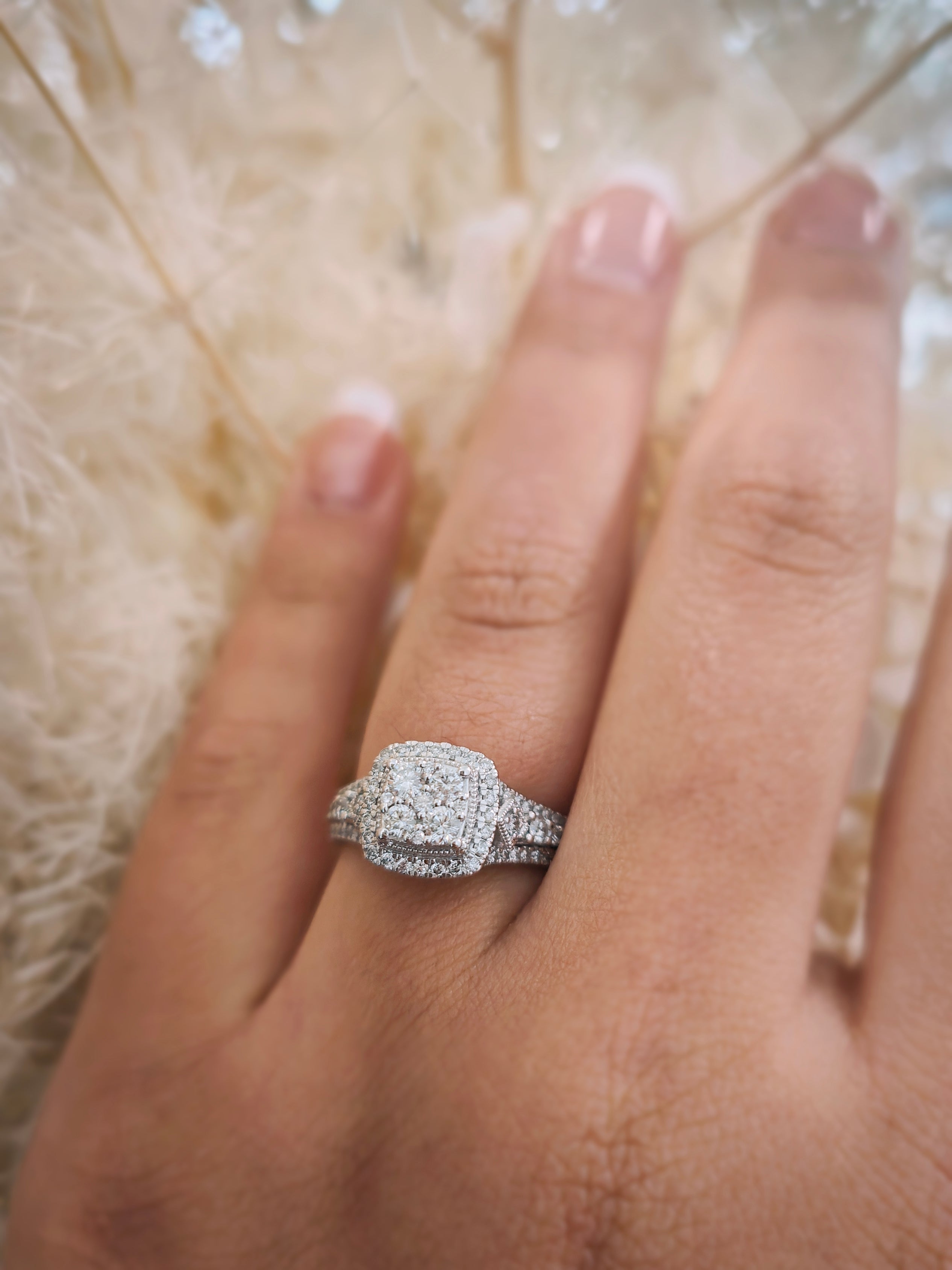 This dazzling ring showcases a cushion-cut diamond nestled within a delicate halo of shimmering diamonds, maximizing its brilliance. The split shank band, also adorned with diamonds, adds a touch of modern elegance to this captivating design.