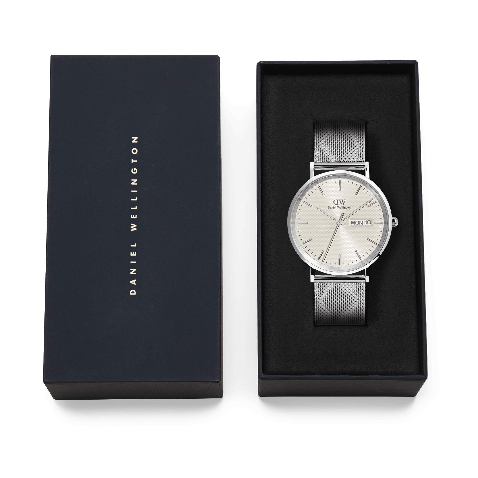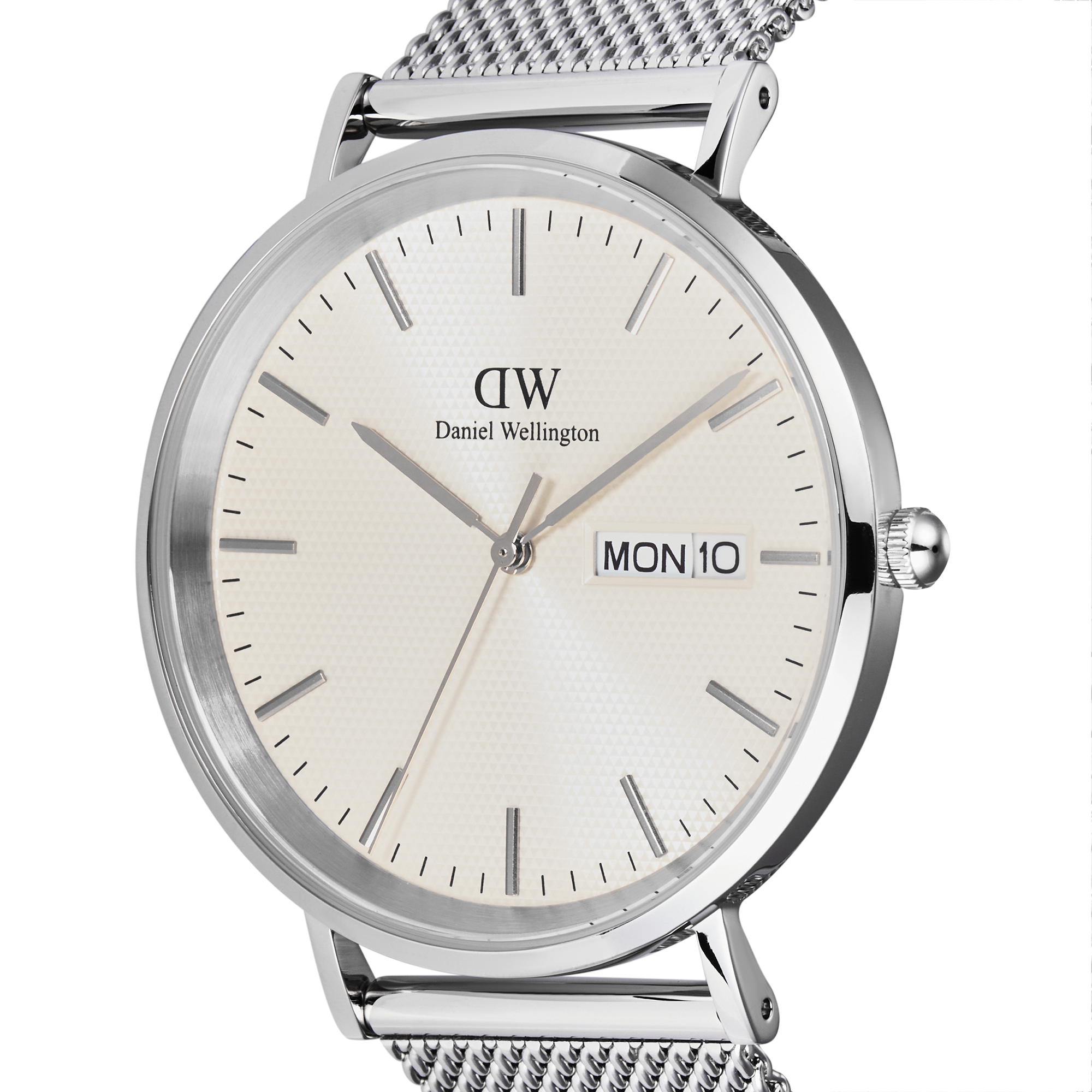 Daniel Wellington's Classic watch, known for seamlessly blending traditional craftsmanship with modern functionality, just got a well-deserved update. This design features a window that displays the date and the days of the week. The watch shares a similar case design as the previous “Multi-eye” with a circular brushed inside-chamfer between glass and dial, but the Classic Day Display boasts a pristine semi-transparent triangle pattern on the dial, creating a very subtle and elegant shimmering effect.