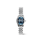 The slightly heavier oval case enhances its elegant silhouette, while the tapered lugs ensure a smooth transition to the link bracelet. The watch boasts metal Roman numerals atop a disc pattern at the center of the sunray dial, and both the case and bracelet are polished to a bold, shimmering finish.