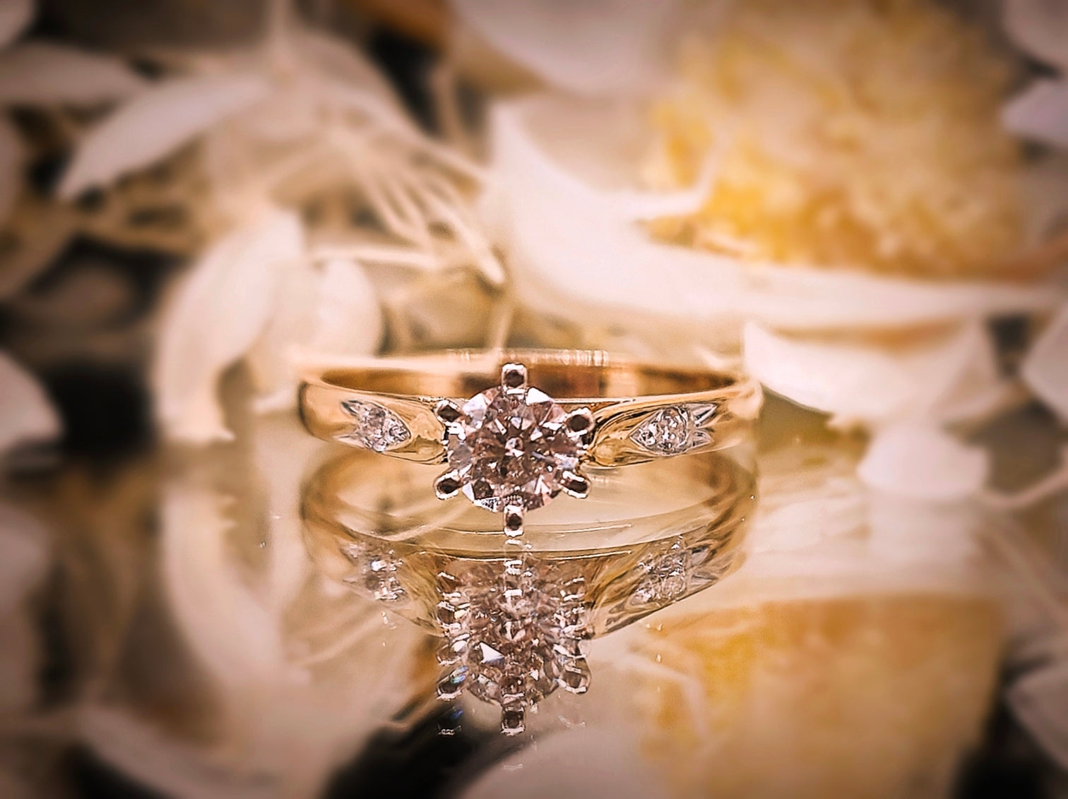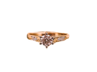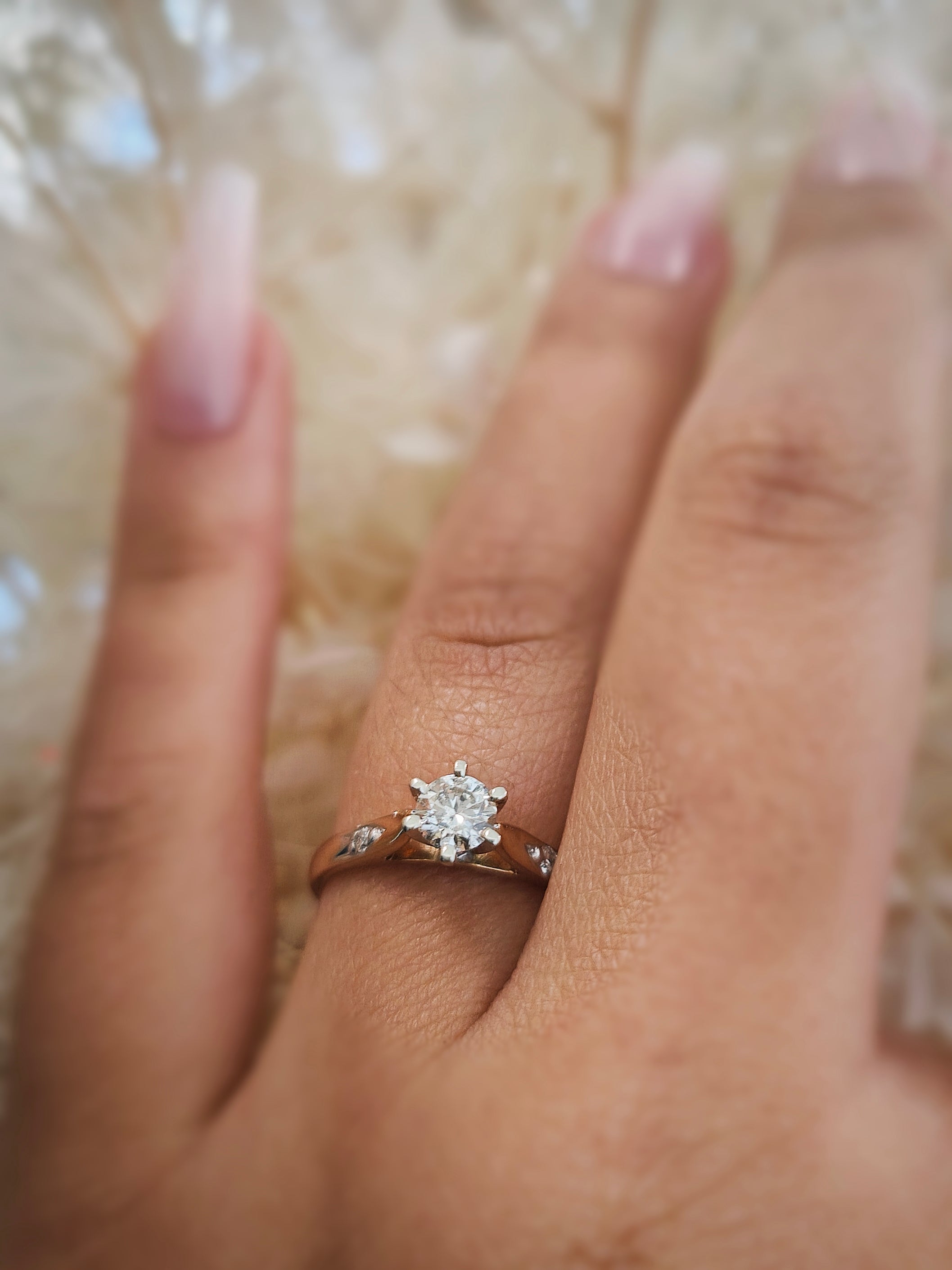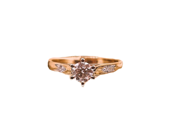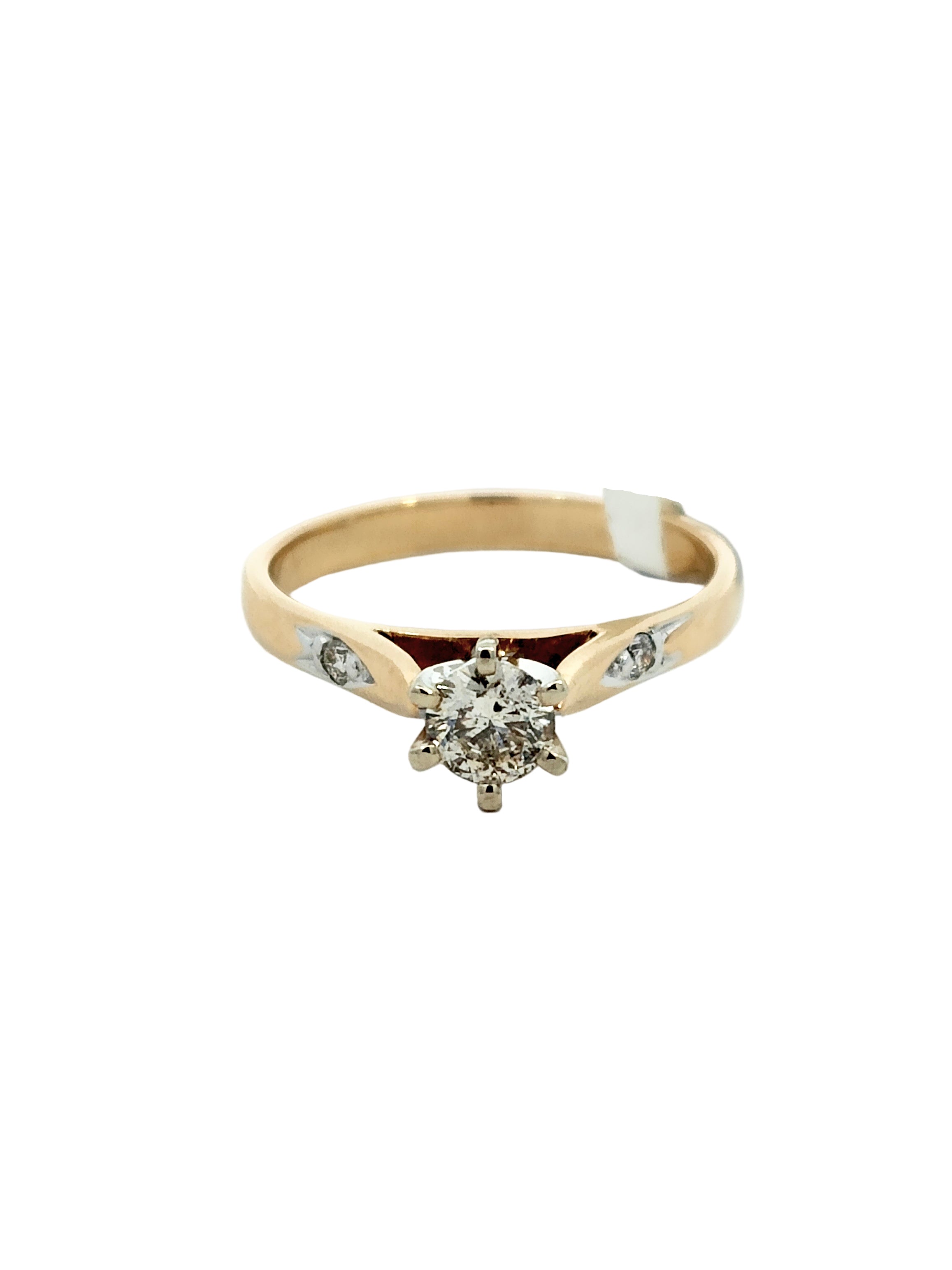 Crafted in warm gold, this exquisite ring features a dazzling round-cut diamond in a six-prong setting, flanked by delicate marquise-accented side stones for added brilliance. Its timeless elegance and intricate detailing make it the perfect symbol of love and commitment. Whether for an engagement or a cherished gift, this ring is a true treasure to behold.