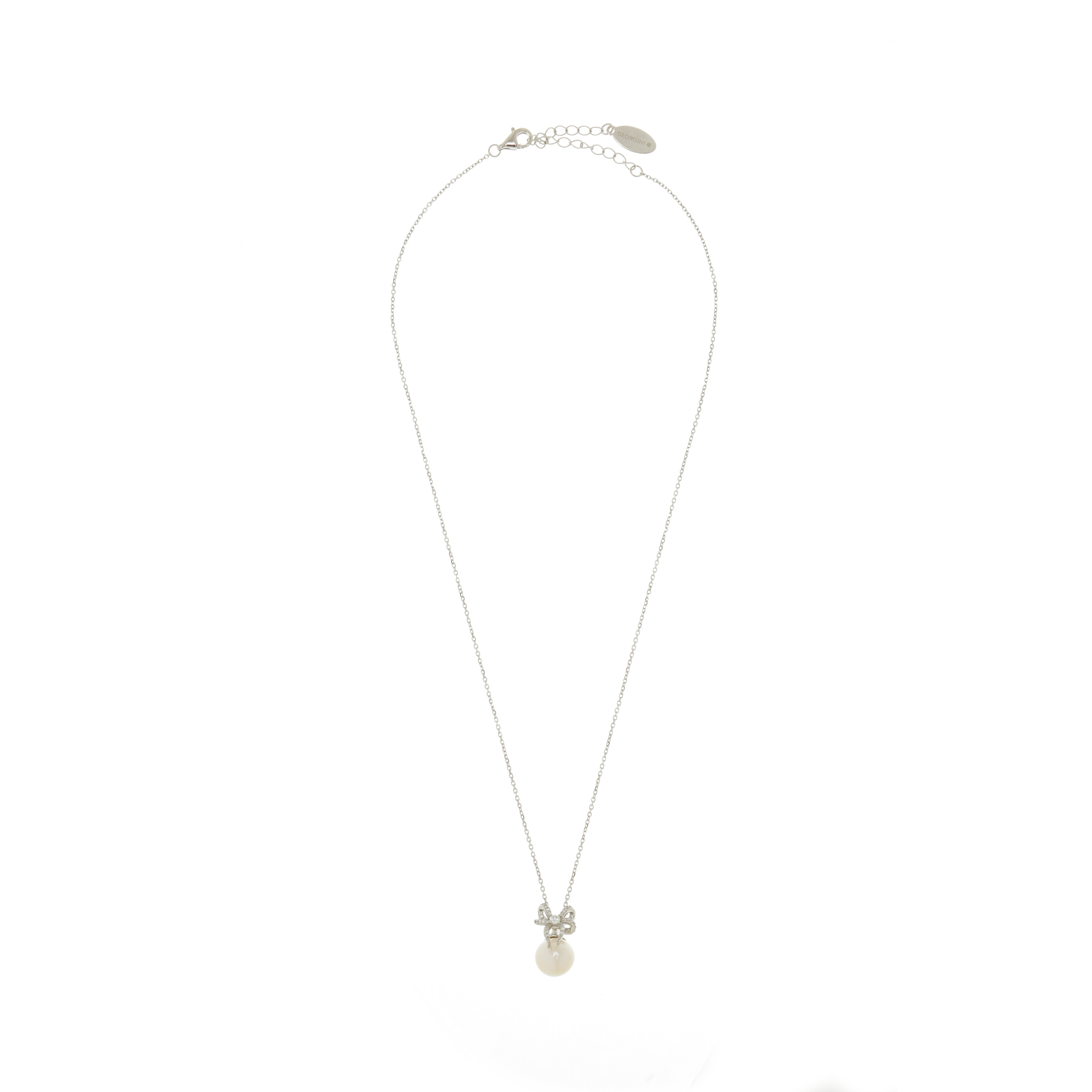 1. **Material:** The GEORGINI SWEETHEART Bow Freshwater Pearl Necklace is meticulously crafted from rhodium-plated 925 sterling silver, ensuring both a brilliant shine and exceptional durability. The rhodium plating enhances the lustre and provides protection against tarnishing, making this necklace a lasting and opulent accessory.