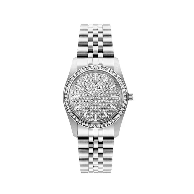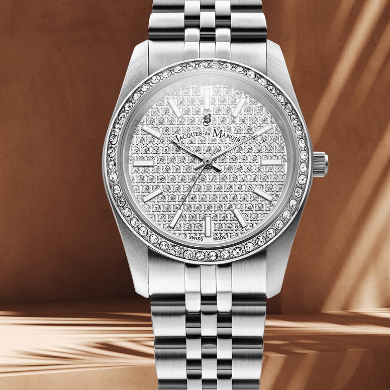 The Inspiration captivates with refined elegance and a sophisticated design. Its shimmering silver dial, adorned with sparkling stones, creates a dazzling focal point reminiscent of a firework display. Perfect for women who appreciate timeless style, this Swiss-made watch blends luxury with everyday wearability, offering both beauty and precision.