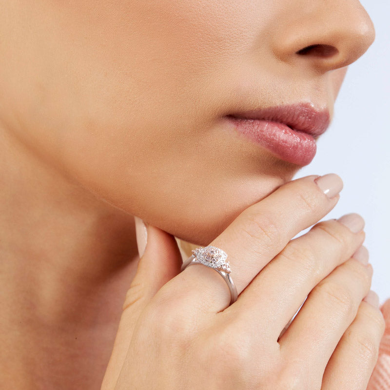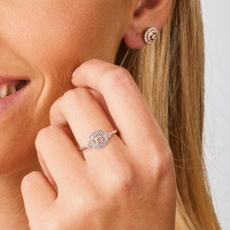 The Gabriella ring features a beautfiul cluster of fancy light pink Argyle diamonds, surrounded by a sparkling halo of white diamonds. This centrepiece is nestled between two lovely pink diamonds for a touch of uniqueness.
