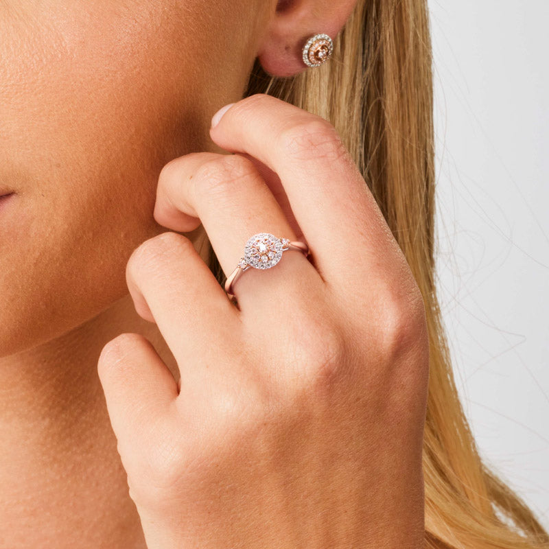 The Audrey ring features a beautfiul cluster of fancy light pink Argyle diamonds, surrounded by a sparkling halo of white diamonds. This centrepiece is nestled between two lovely pink diamonds for a touch of uniqueness.