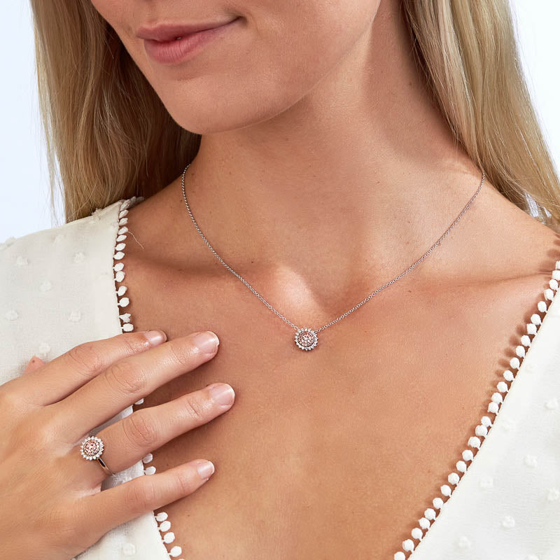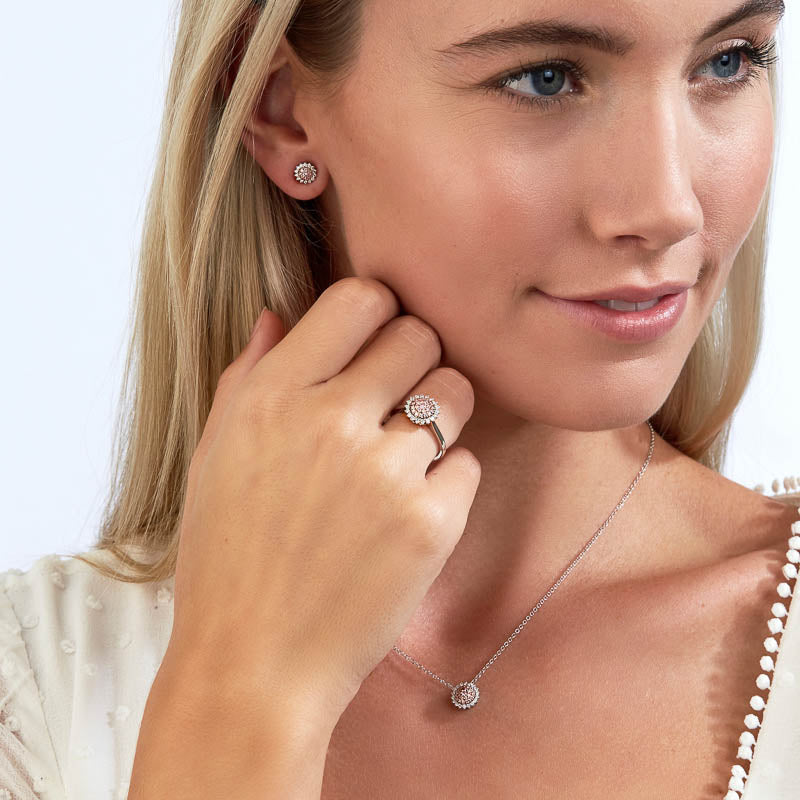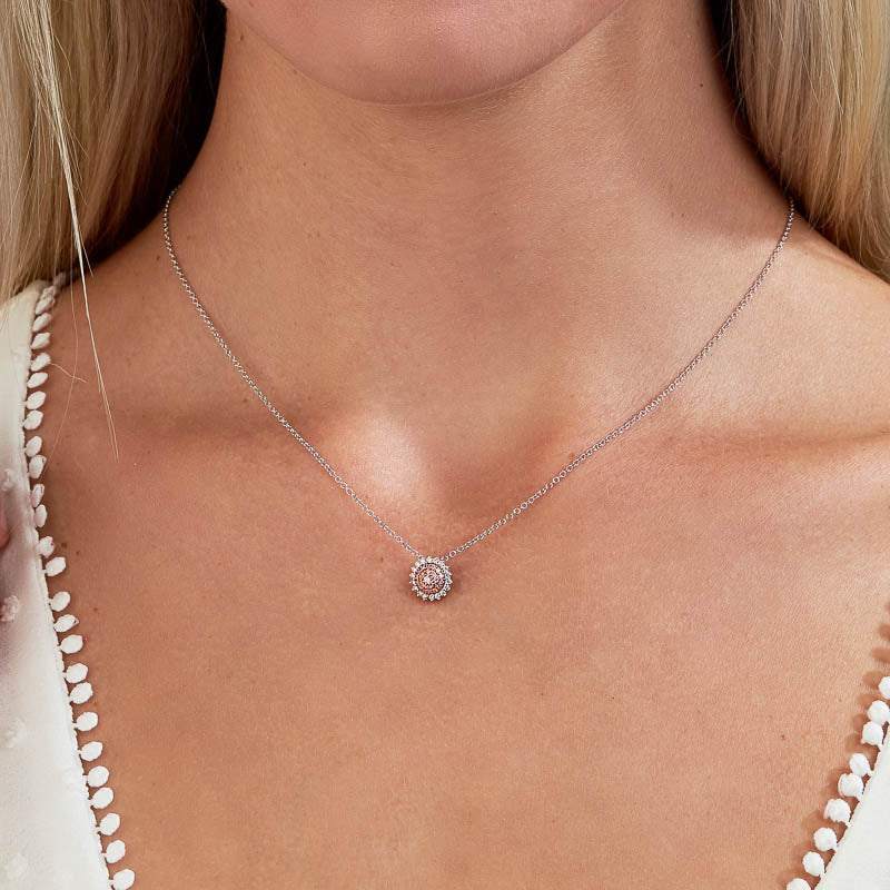 A cluster of Australian Argyle pink diamond pave set with a centre feature stone is finished with a classic shared claw halo of white diamonds. Set in 18ct white and rose gold.