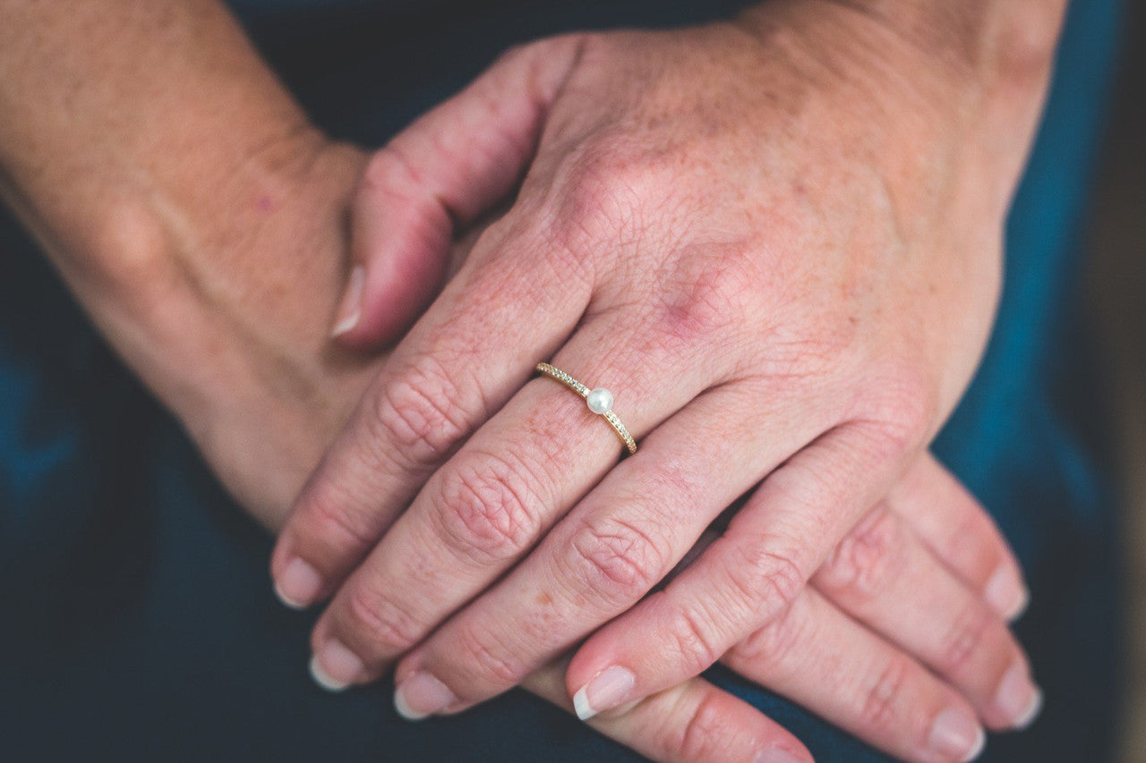 The perfect Pearl stacker ring has arrived for all those who love Pearls in the Cherished ring from the Heirloom collection. Wear it on its own or combine it with the Silver and Rose gold to make a fantastic mixed metal set. Featuring a luxurious 4mm shell-based pearl complemented by a 22 stone pave set band, the Cherished ring is a crafted from 925 Sterling Silver and 18ct Gold plated.