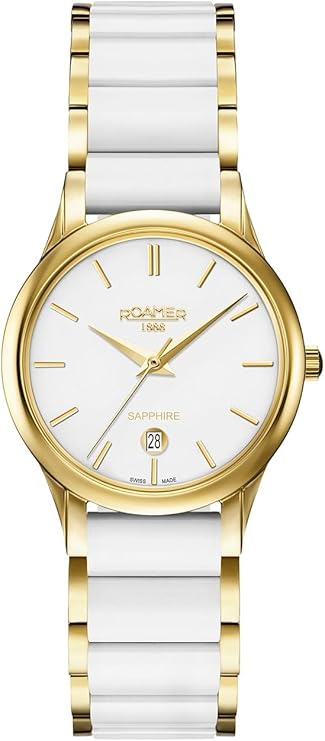 Experience timeless elegance with the Roamer Ceraline Ceramic Swiss Watch for ladies. Crafted with precision Swiss engineering, this watch features a durable ceramic case that resists scratches while offering a sleek and modern look. Its refined design complements any outfit, making it perfect for both everyday wear and special occasions. Lightweight and comfortable, it ensures all-day wearability without compromising style. Embrace a blend of sophistication and reliability with this luxurious timepiece designed to elevate your wristwear collection. Perfect for those who appreciate quality and timeless beauty.