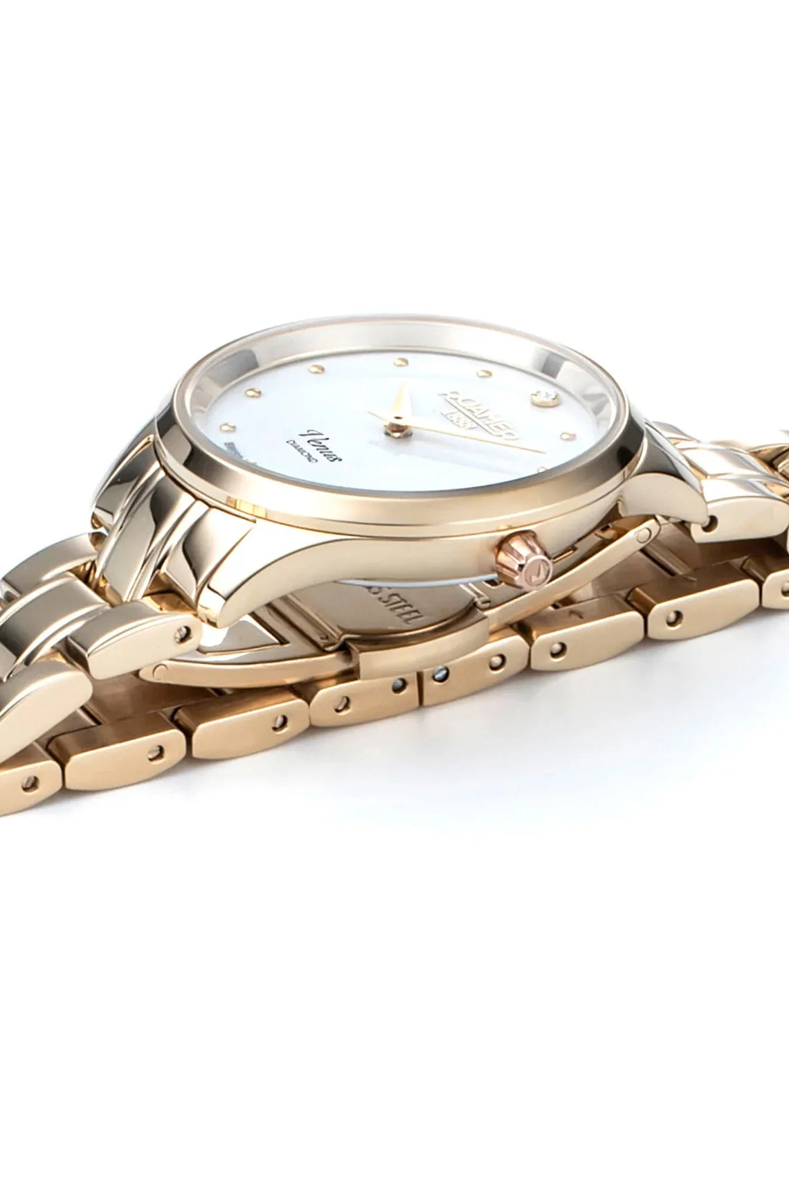 Depending on the model, the VENUS DIAMOND features hour markers, sword-shaped hands, crown and smooth bezel in stainless steel, gold, or rose gold plating.