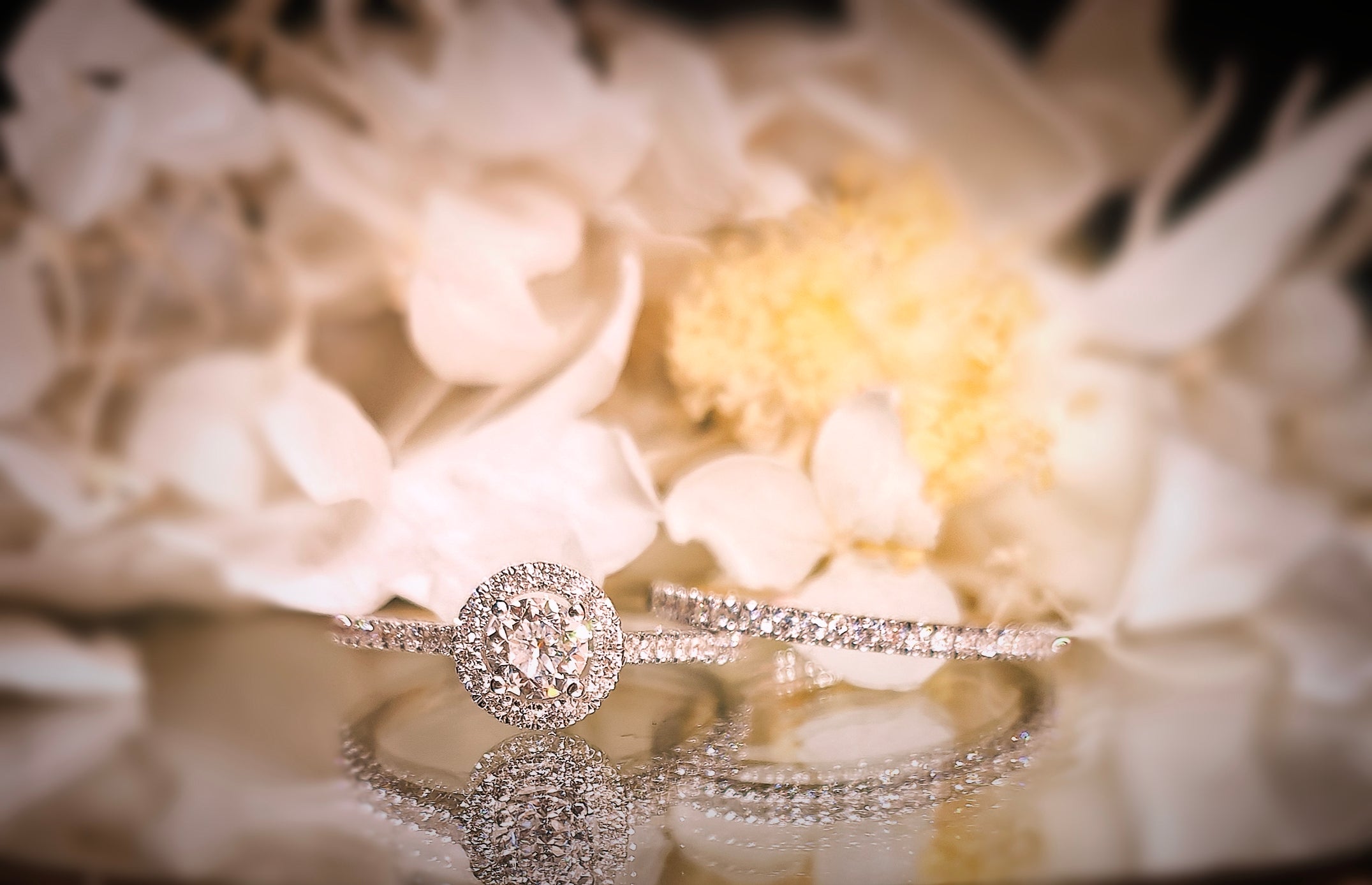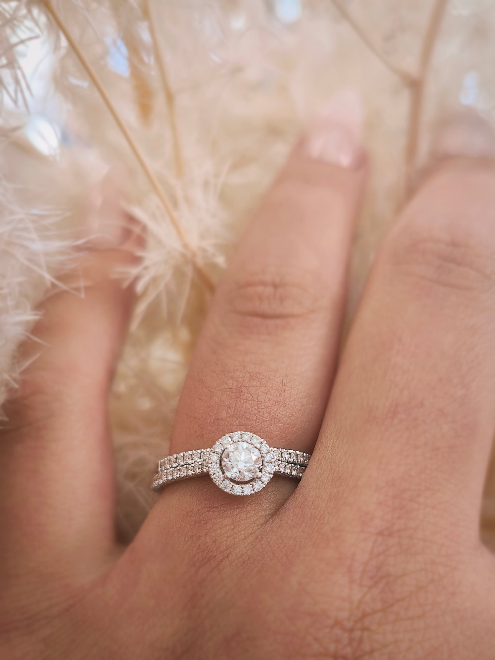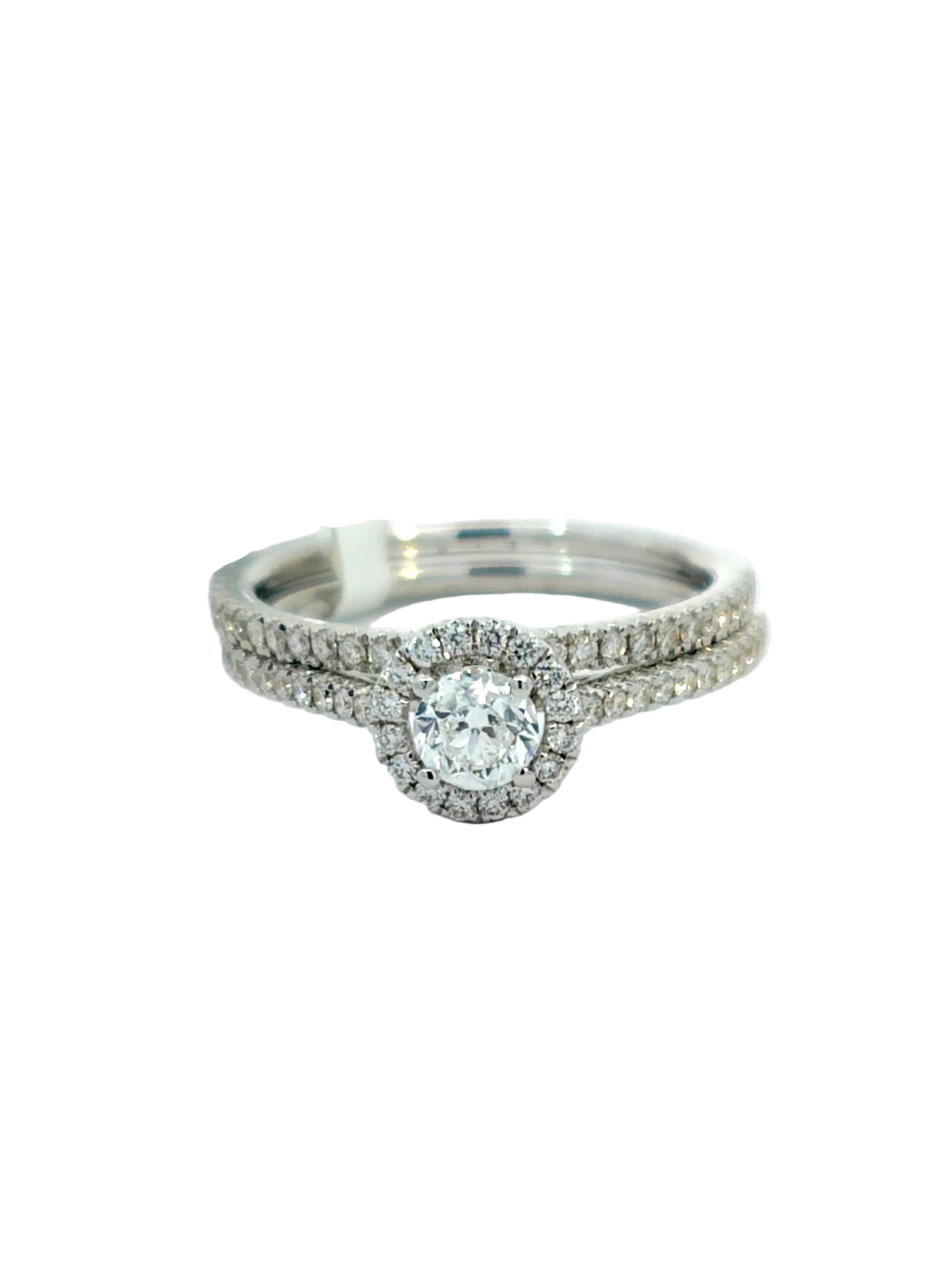 A celestial dance of light defines this breathtaking halo engagement ring and matching diamond band. The delicate pave setting enhances the brilliance of the central stone, creating an aura of timeless elegance. Together, they symbolize a love that shines brighter with each passing day.