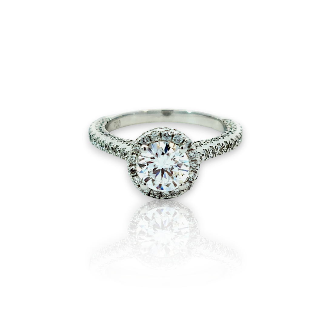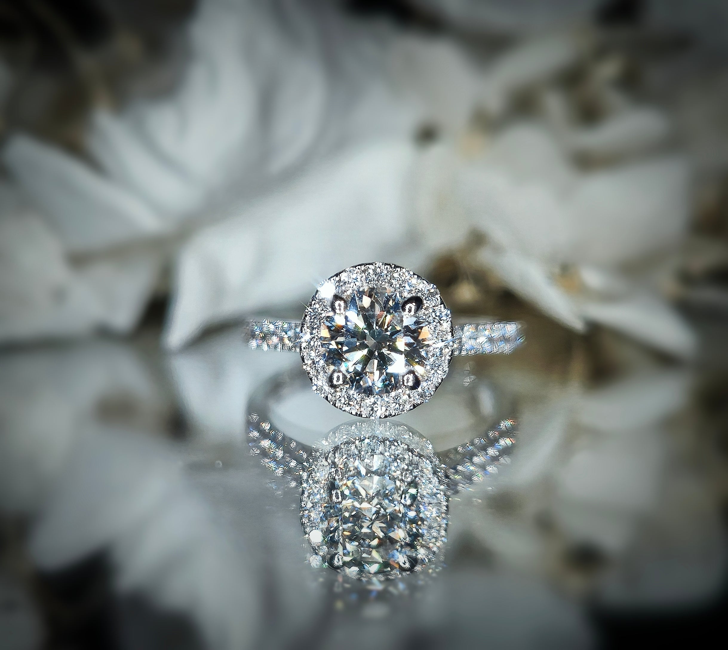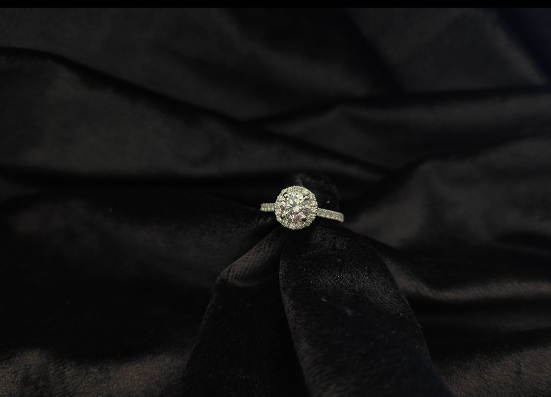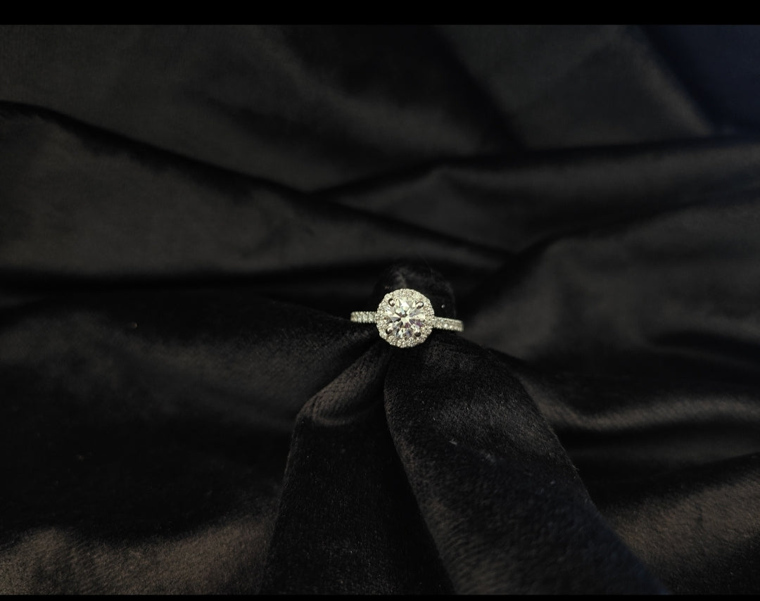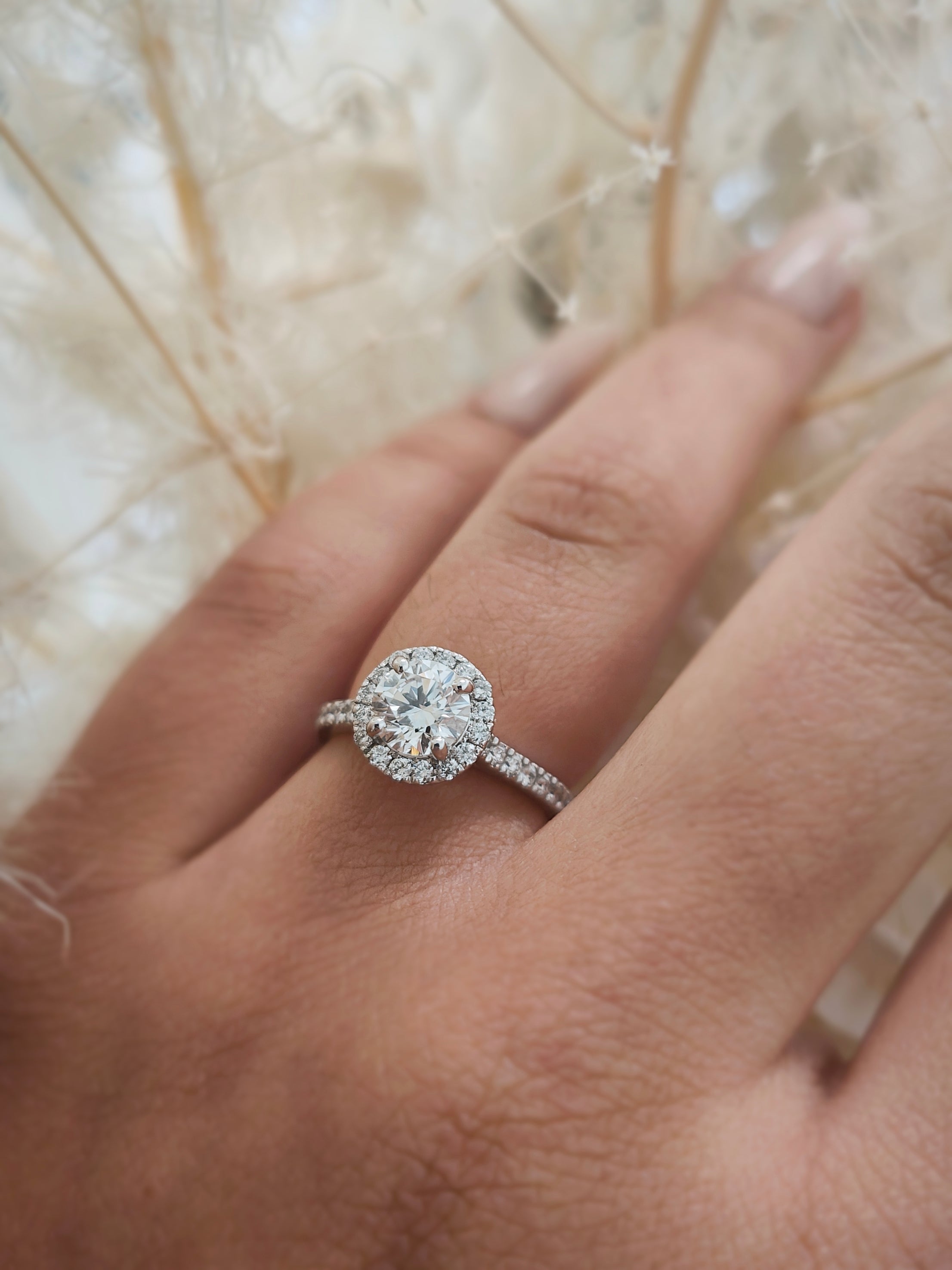 Witness the blossoming of brilliance with the Starlight Bloom Ring. A captivating round diamond, like a star at its zenith, is encircled by a halo of sparkling pave diamonds, creating a breathtaking floral effect. The delicate, diamond-accented band adds to its ethereal charm. Let the Starlight Bloom Ring be the radiant symbol of your love, blooming forever.
