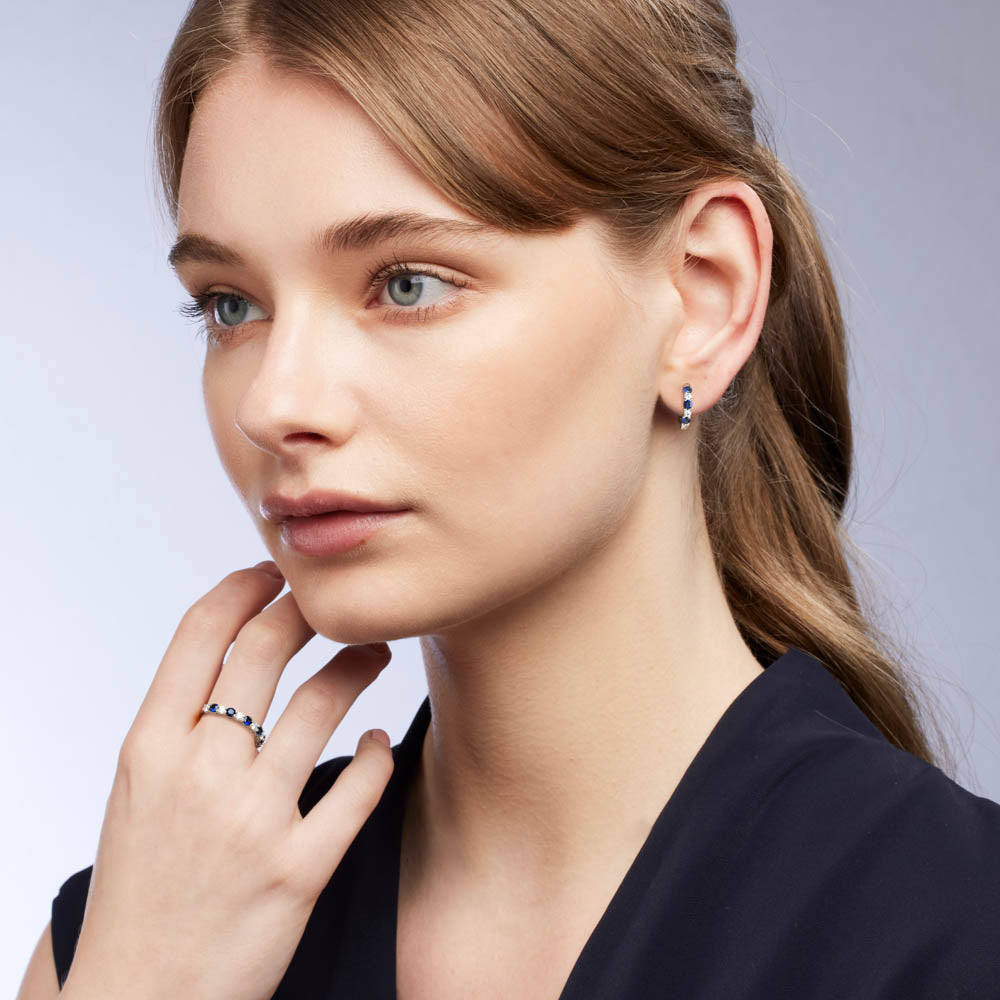 A classic diamond hoop earring with a contemporary twist, Angelica features six incredible round cut Blue Australian Sapphires, complemented by sparkling natural White Diamonds to further enhance the vivid Sapphire hues. Crafted in durable 18ct White Gold, these hoop earrings are elegant and stylish, definitely an eye-catcher.