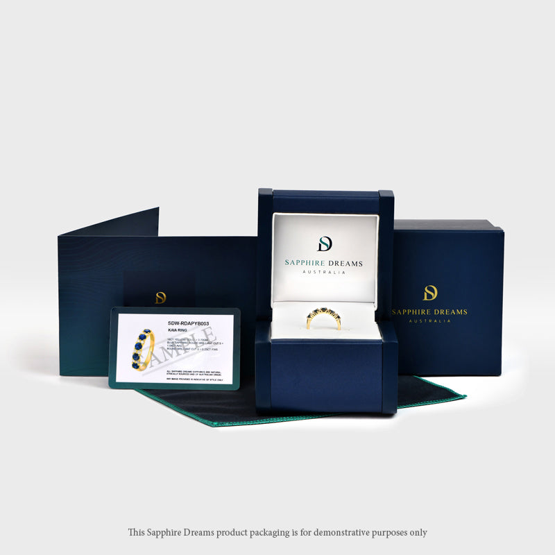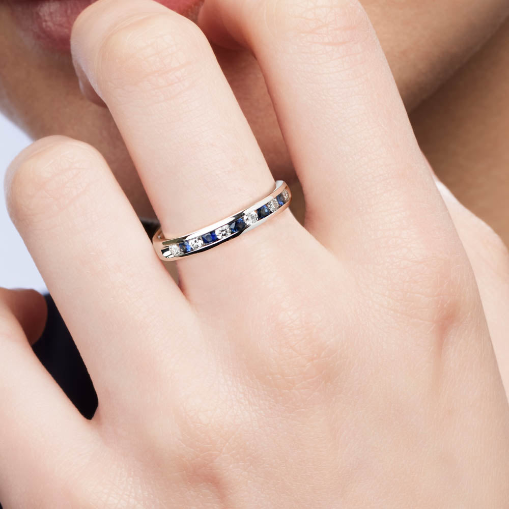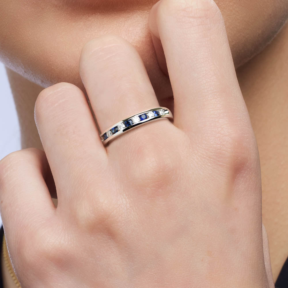 Unique and trendy, the Catriana Ring features round cut Blue Australian Sapphires and white diamonds in an alternating pattern, set in an 18ct White Gold band, a durable and long lasting metal. Elevate your look with this stunning piece.