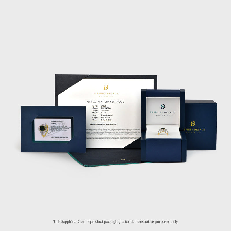 Santini features an elegant Blue Australian Sapphire surrounded by glistening round cut White Diamonds, set on a diamond set 18ct White Gold band, a durable and long lasting metal. This ring is extremely versatile and stunning, the perfect accessory to add a hint of elegance to your look.