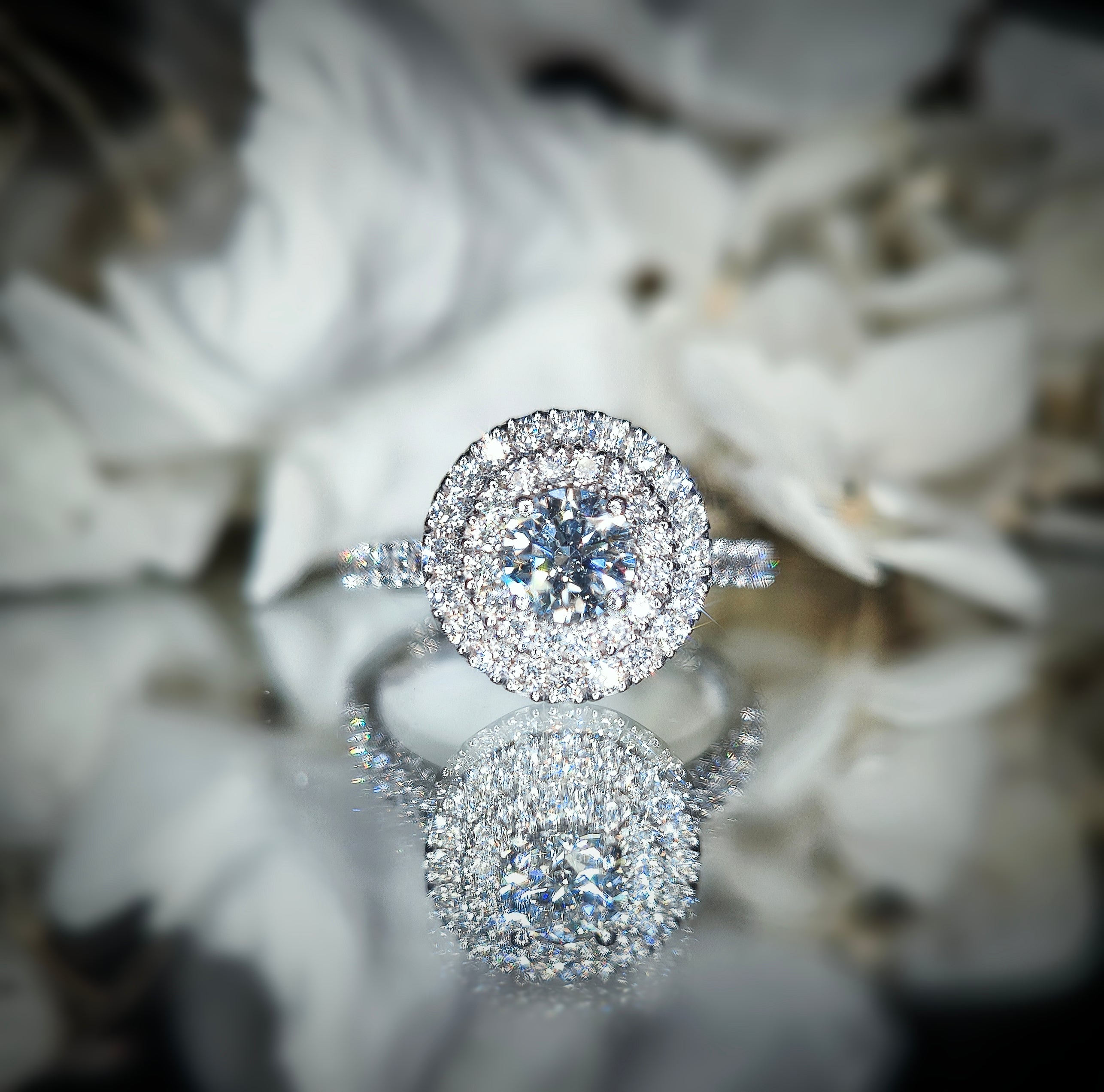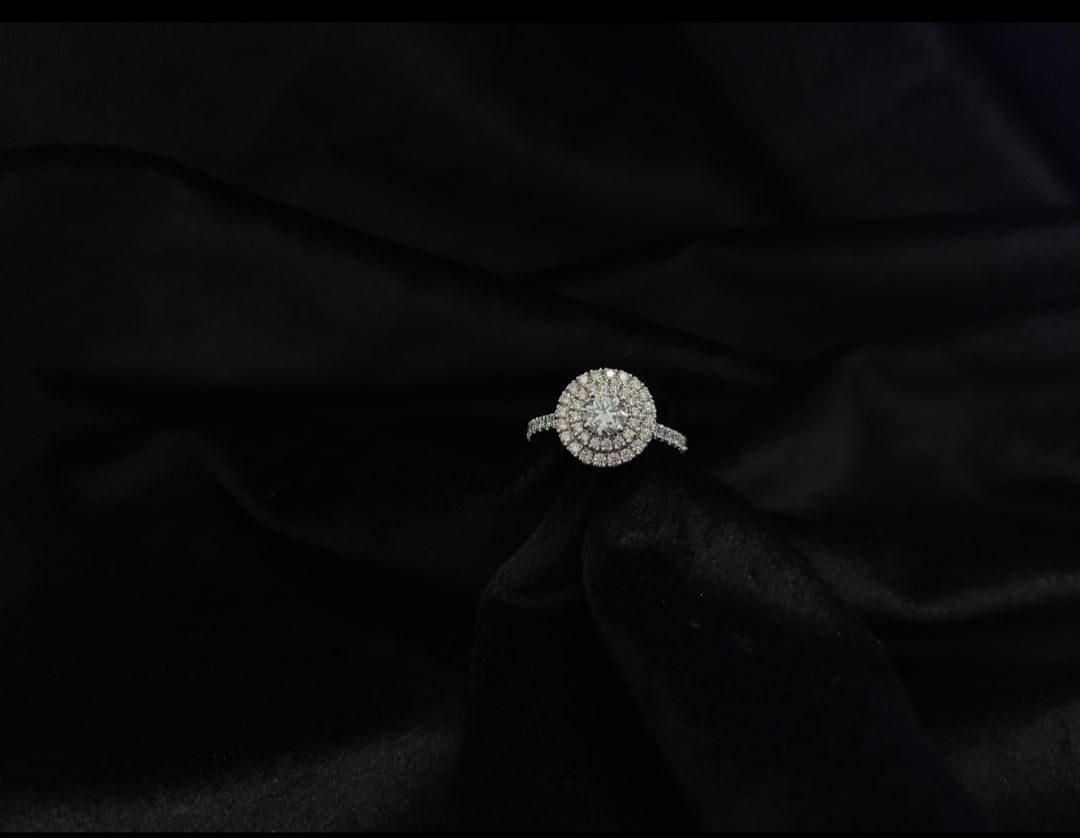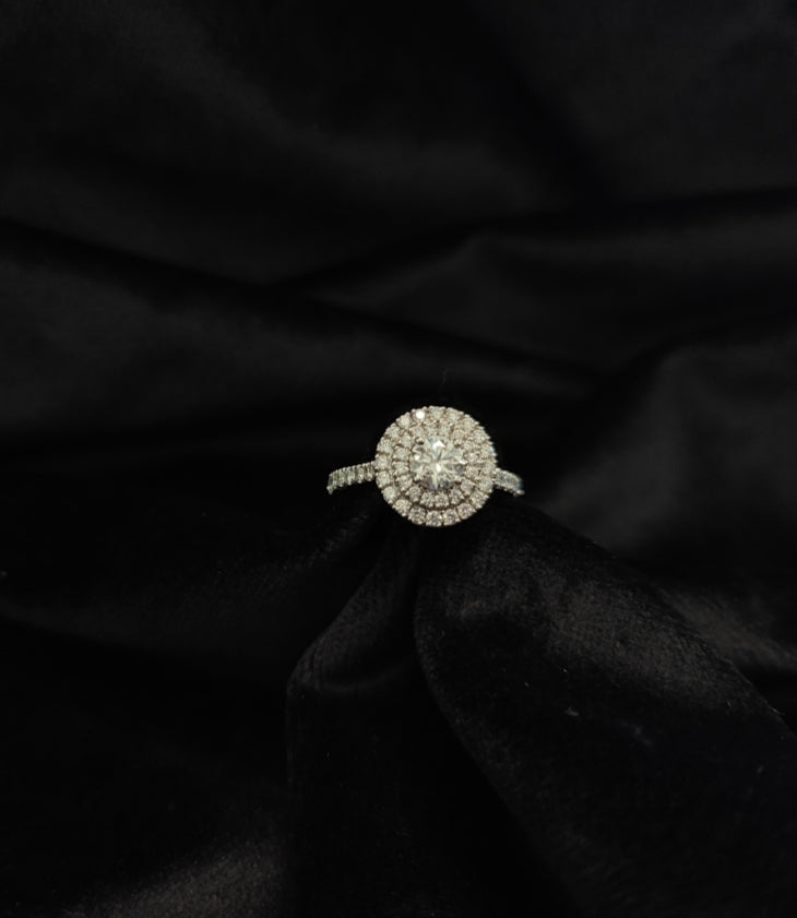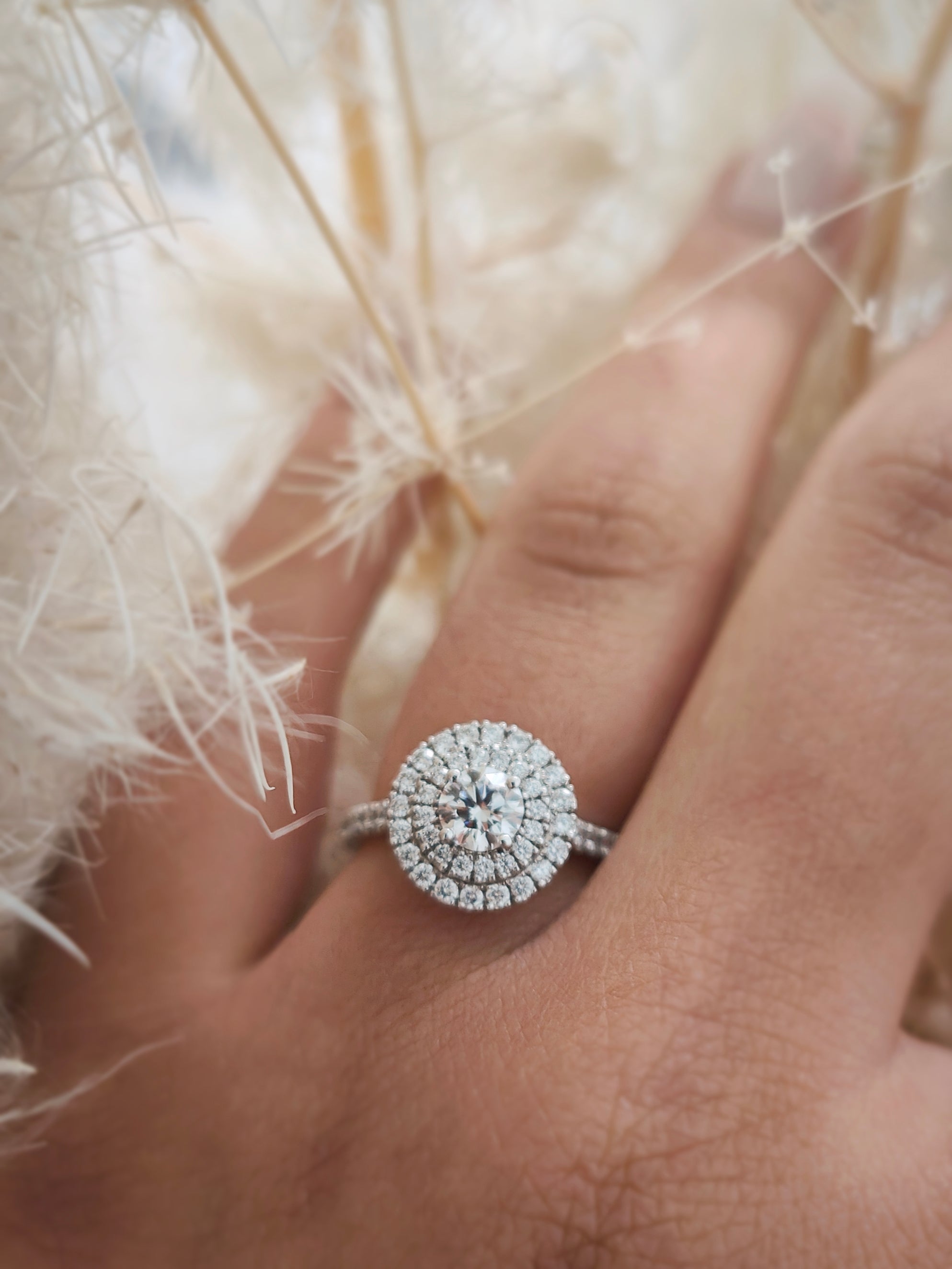 Experience the captivating beauty of the Double Bloom Ring. A central diamond, like the heart of a flower, is encircled by two layers of dazzling pave diamonds, creating a breathtaking bloom of light. The delicate, diamond-accented band enhances the ring's romantic allure. Let the Double Bloom Ring be a symbol of your love's blossoming beauty and enduring sparkle.