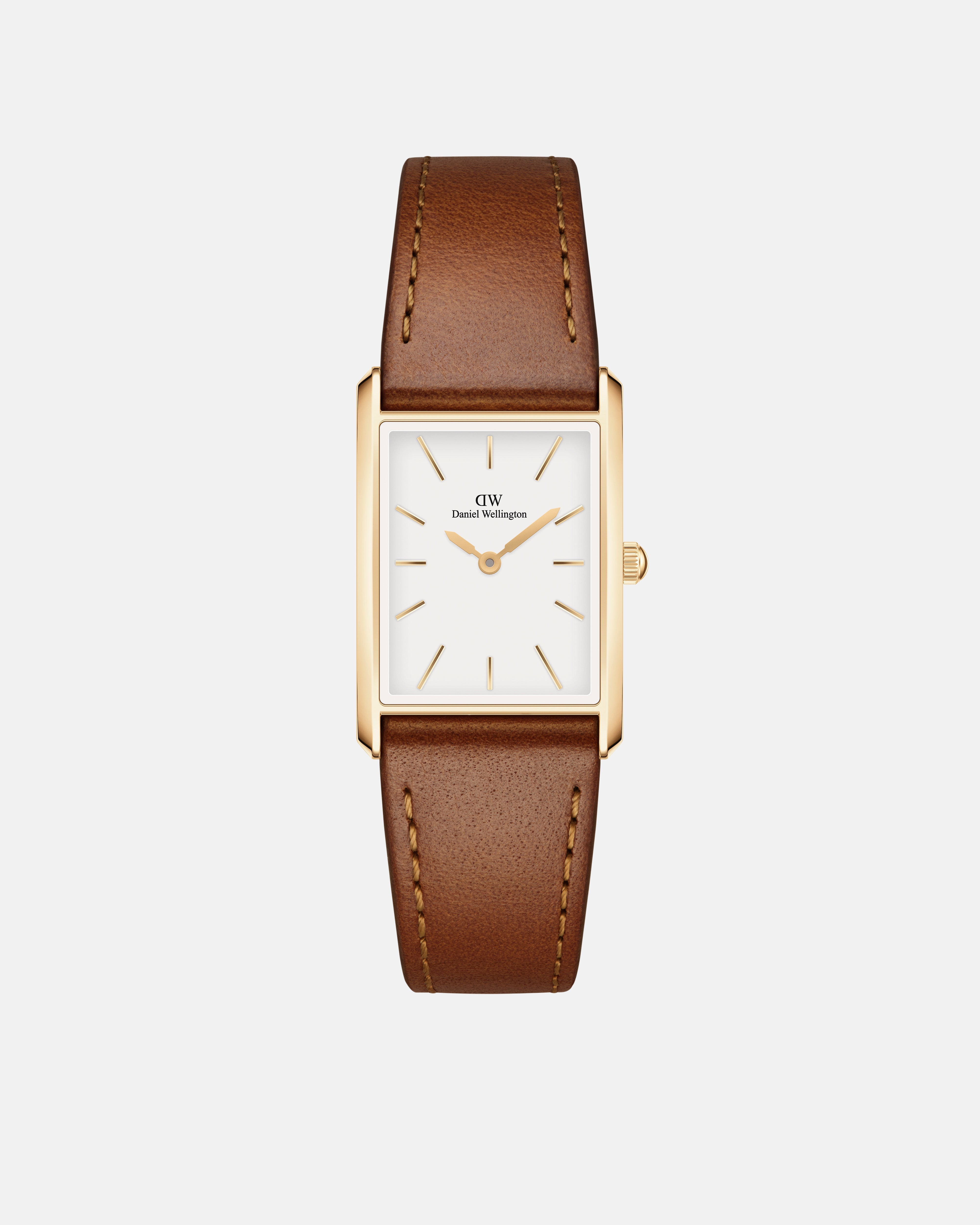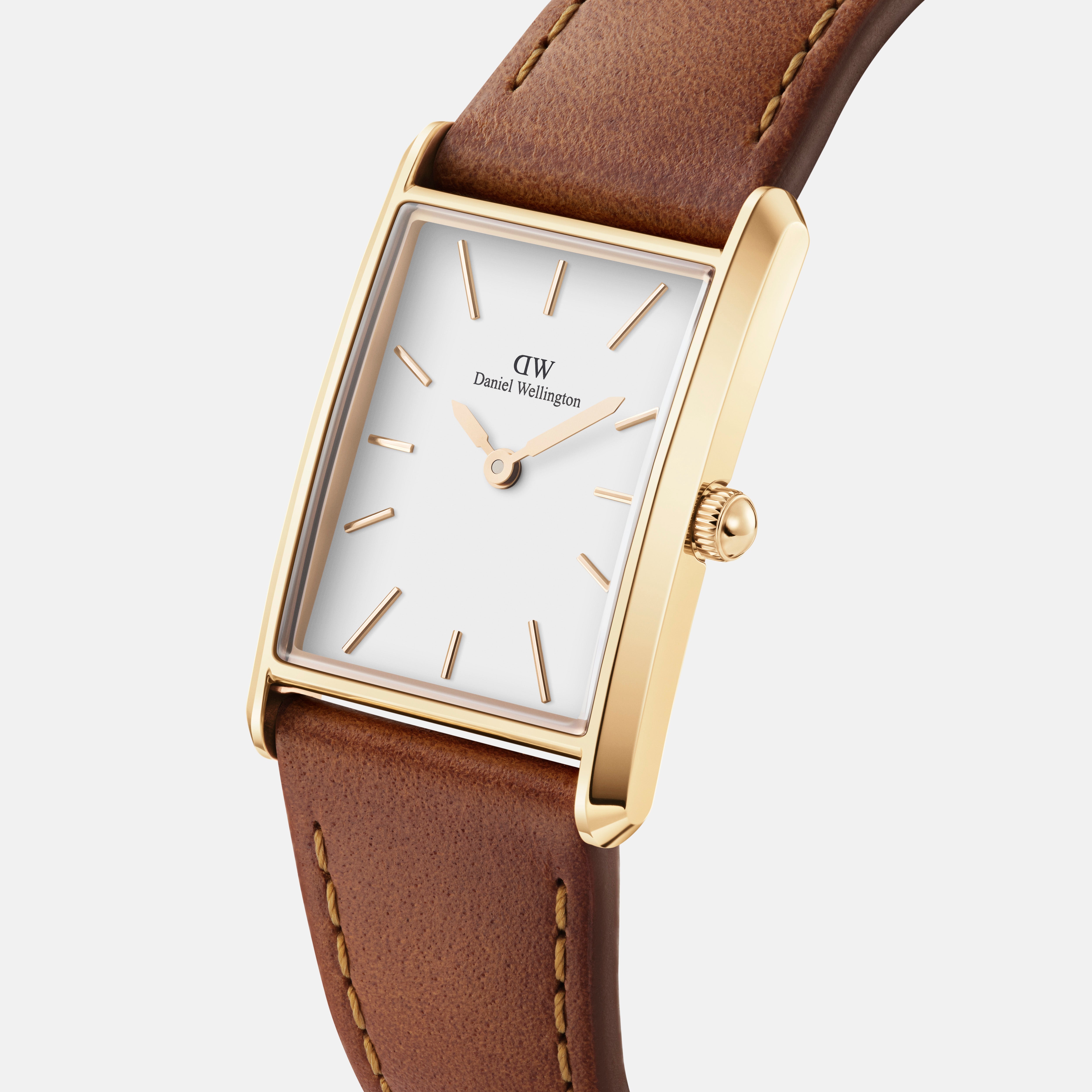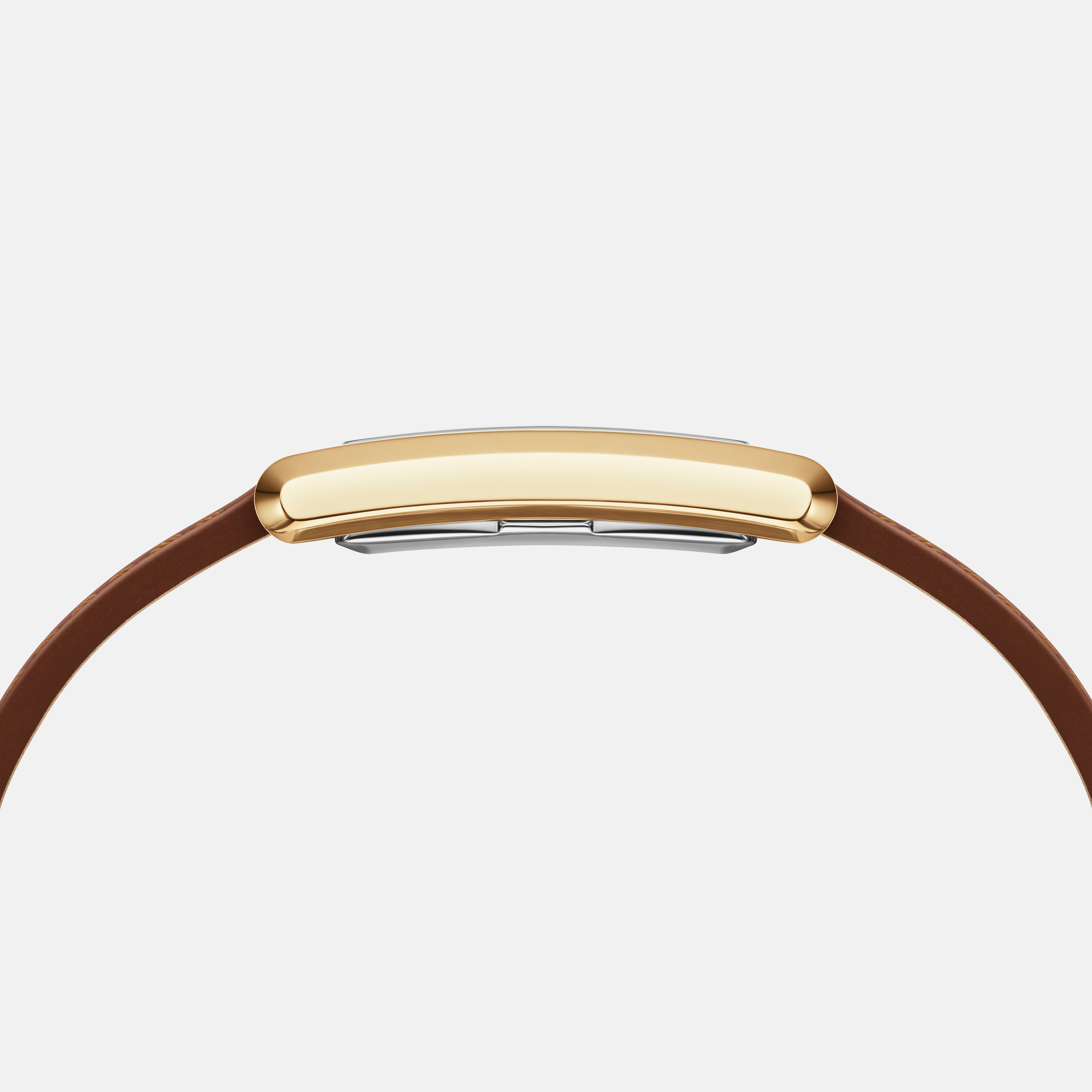 With sleek geometric edges and two sizes to choose from, our Bound collection brings perfect symmetry to your wrist. The curved rectangular case of this gold watch matches the exact width of its crocodile pattern brown leather strap—giving you a seamlessly integrated dial.