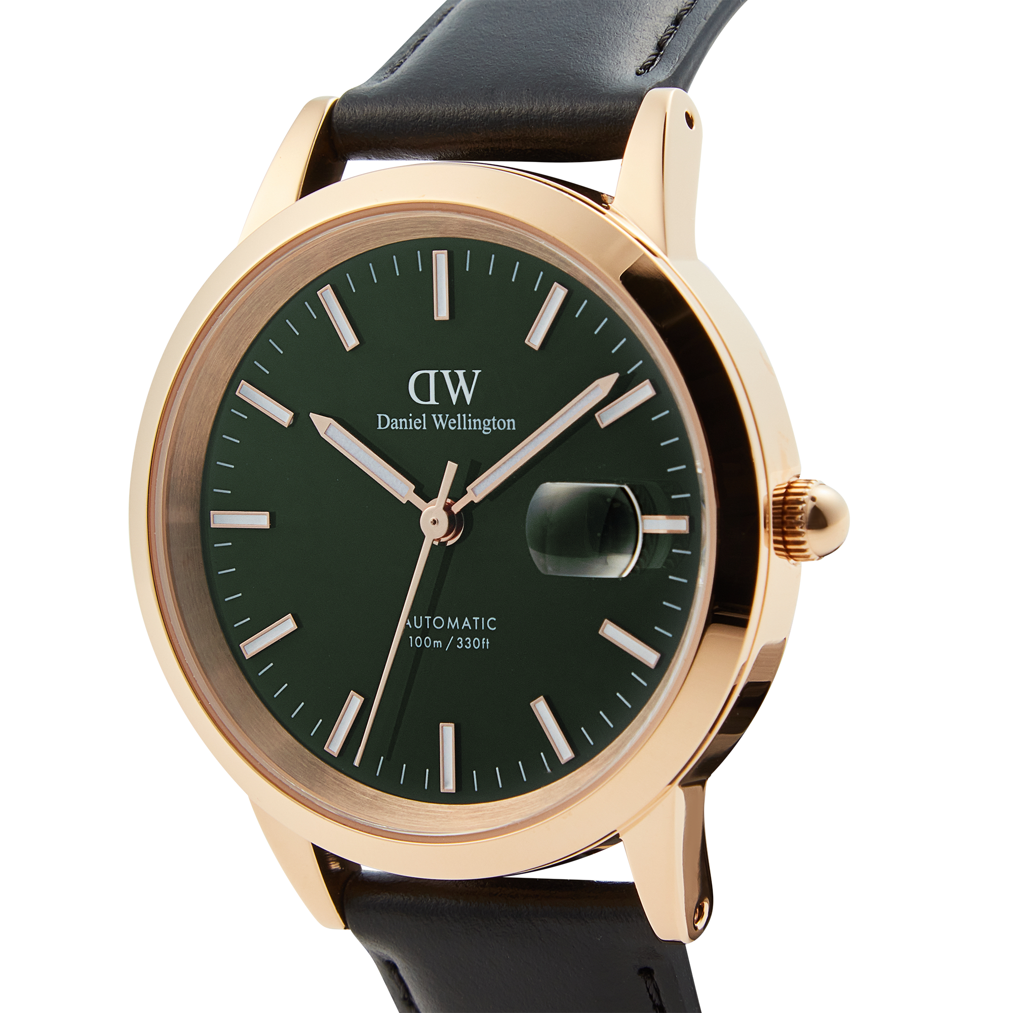 The Iconic Automatic is Daniel Wellington's most advanced timepiece to date, featuring a self-winding movement powered by the motion of your wrist. This version’s emerald green dial has an exclusive enamel finish, delivering a glossy and vivid hue. It boasts glow-in-the-dark index markers and floating hands, a magnified date display, and water-resistance up to 100 meters. The quick release spring bars on the black leather strap make for easy style changes, and there is scratch-resistant sapphire crystal covering the front and back of the rose gold watch. The exhibition case back exposes the automatic movement inside. A watch designed to get you where you need to be.