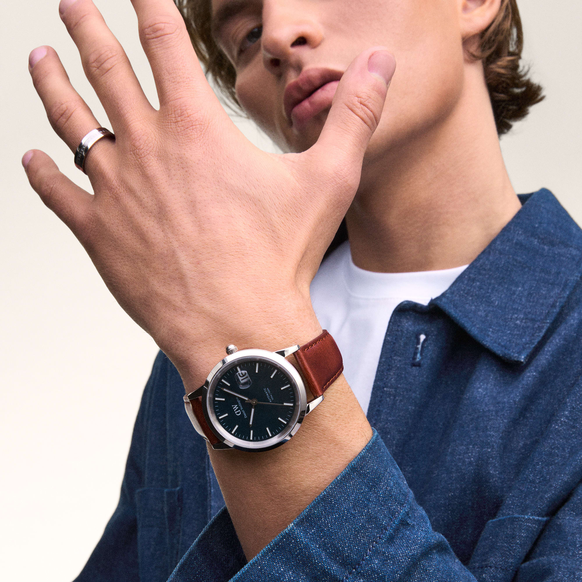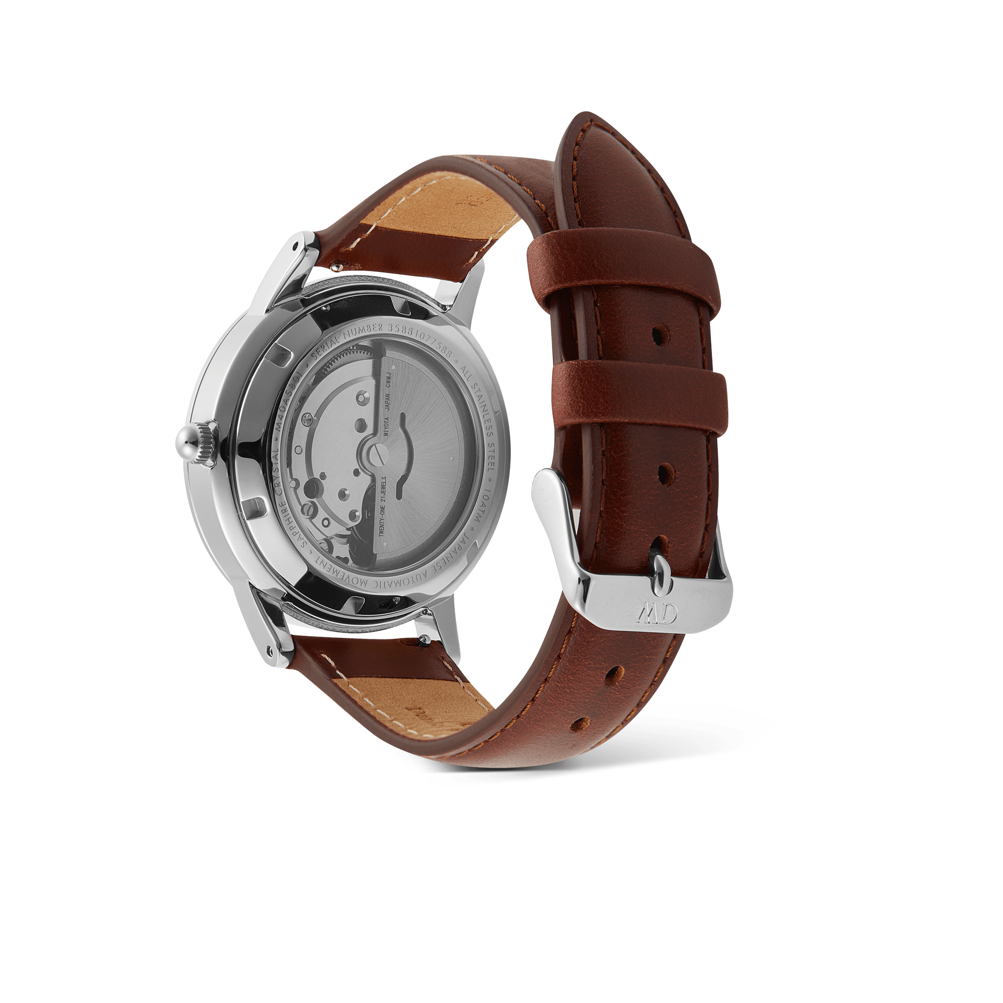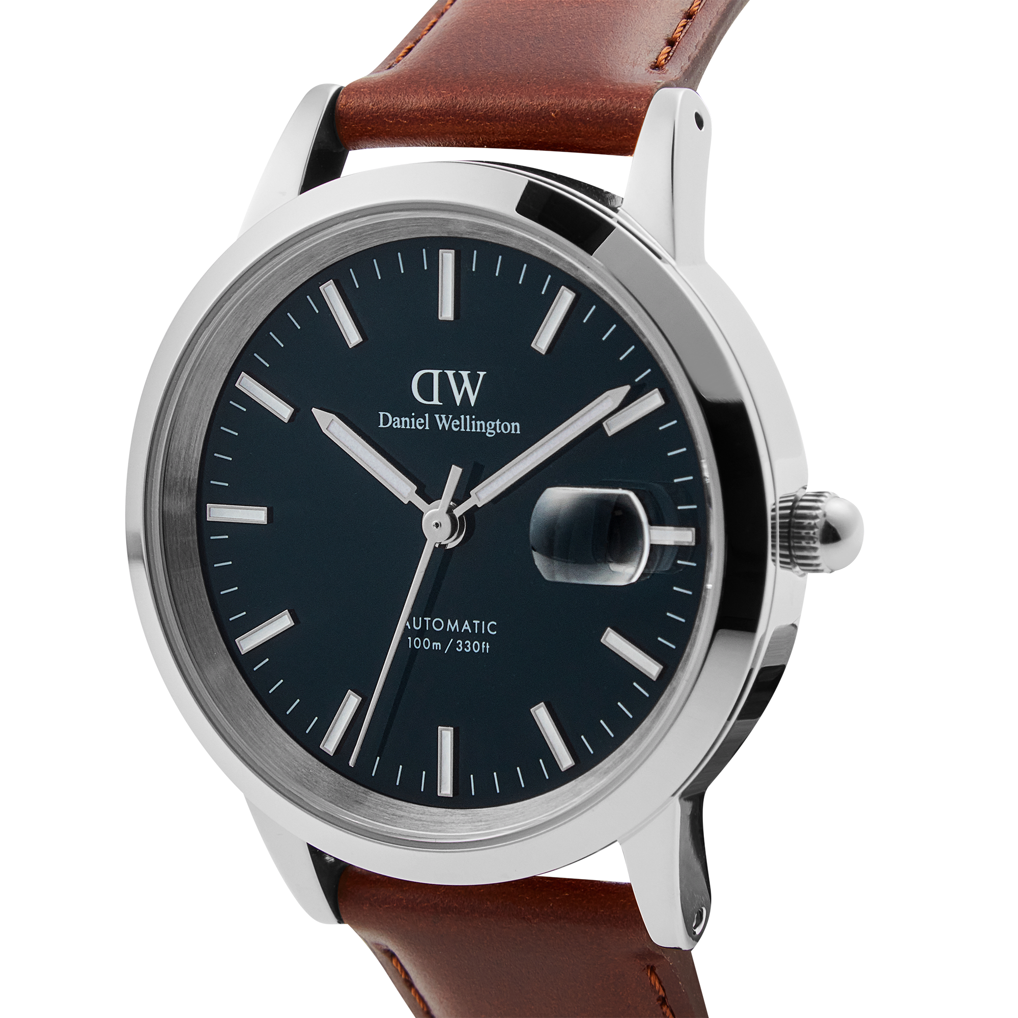 The Iconic Automatic is Daniel Wellington's most advanced timepiece to date, featuring a self-winding movement powered by the motion of your wrist. This version’s arctic blue dial has an exclusive enamel finish, delivering a glossy and vivid hue. It boasts glow-in-the-dark index markers and floating hands, a magnified date display, and water-resistance up to 100 meters. The quick release spring bars on the brown leather strap make for easy style changes, and there is scratch-resistant sapphire crystal covering the front and back of the silver watch. The exhibition case back exposes the automatic movement inside. A watch designed to get you where you need to be.