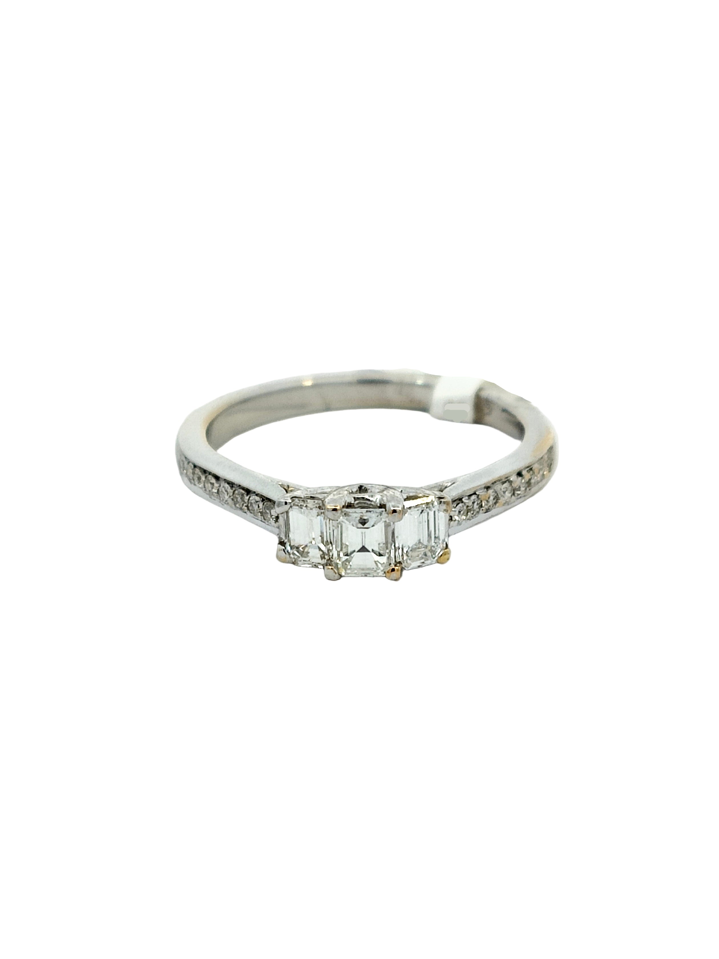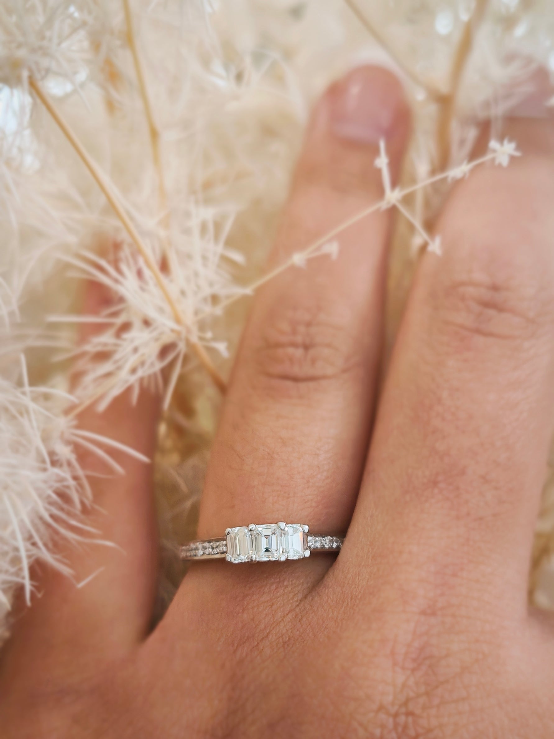 This exquisite ring features a trio of emerald-cut diamonds, with a prominent center stone flanked by two smaller stones, creating a classic and sophisticated look. The sleek, streamlined design is enhanced by the clean lines of the emerald cuts and the subtle sparkle of the diamond-set band