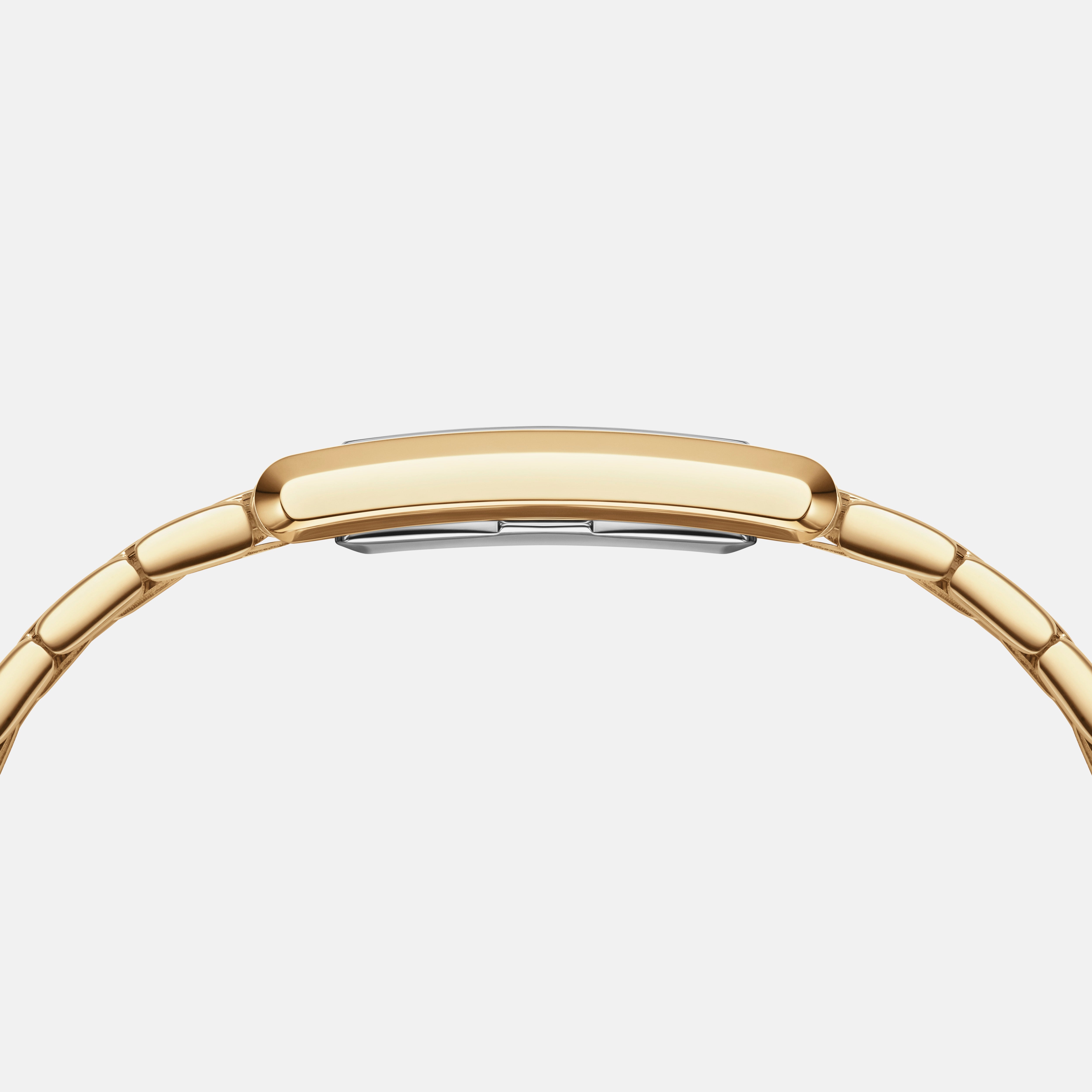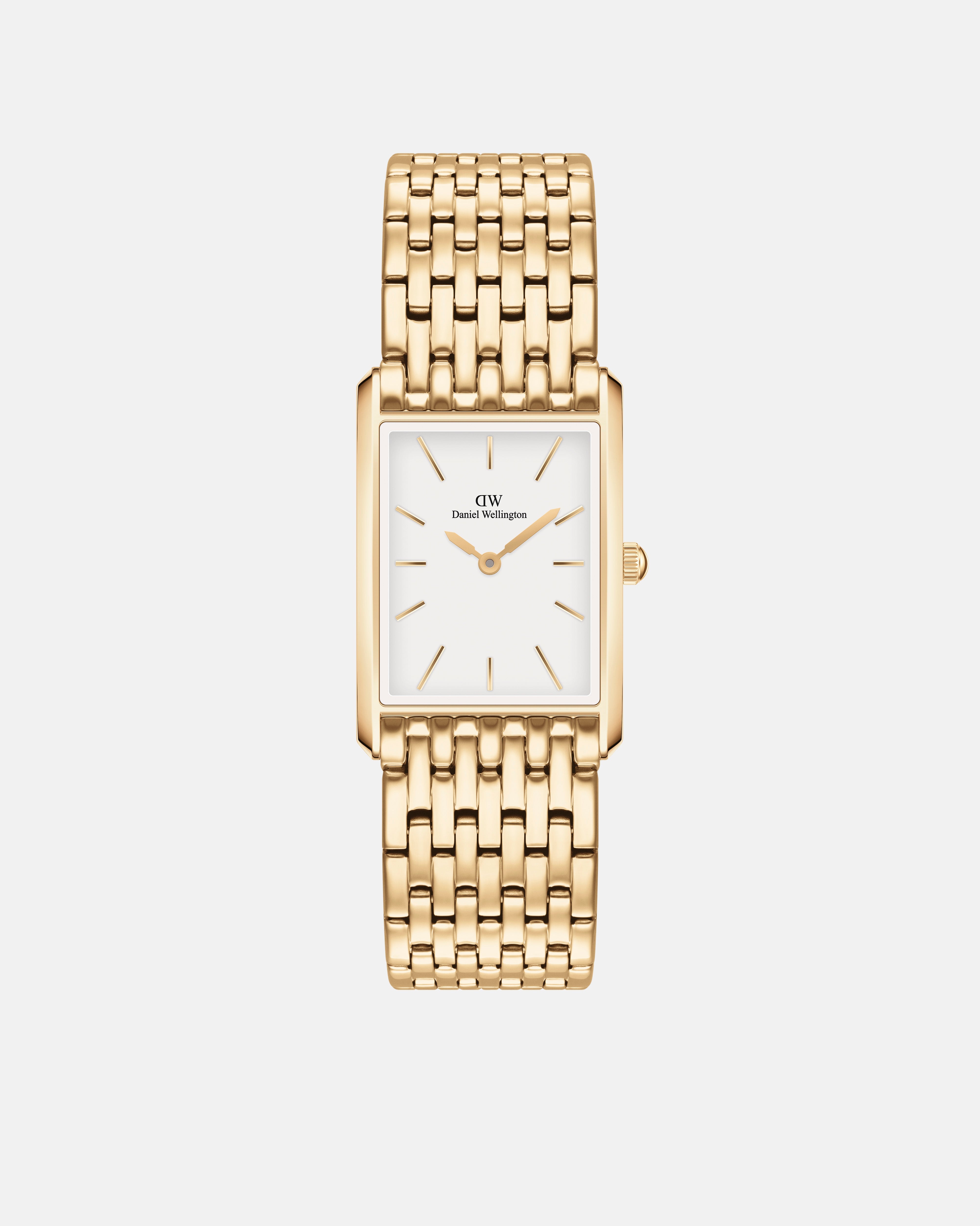 With sleek geometric edges and two sizes to choose from, our Bound collection brings perfect symmetry to your wrist. The curved rectangular case of this gold watch matches the exact width of its 9-link strap—giving you a seamlessly integrated dial.