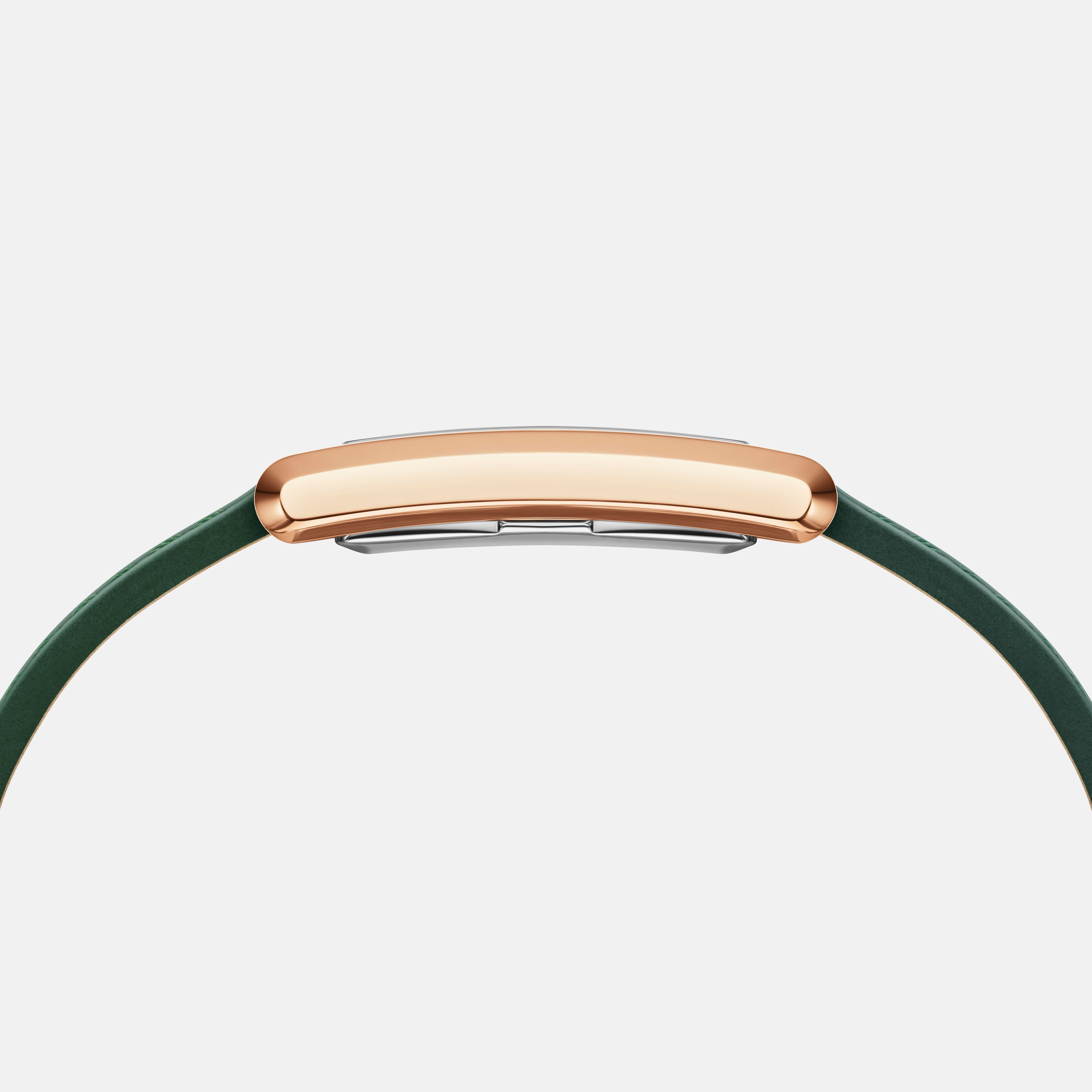 With sleek geometric edges and two sizes to choose from, our Bound collection brings perfect symmetry to your wrist. The curved rectangular case of this rose gold watch matches the exact width of its crocodile pattern emerald leather strap—giving you a seamlessly integrated sunray dial.
