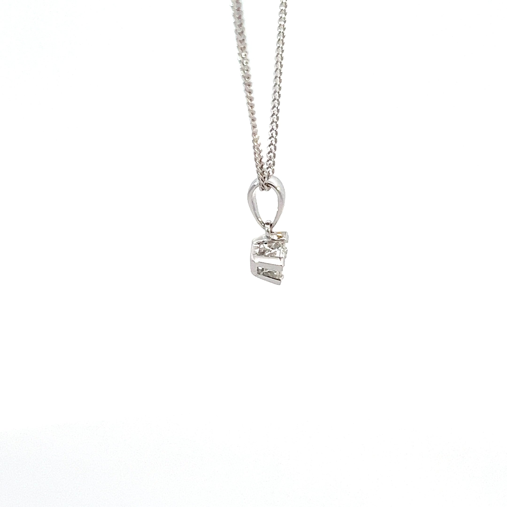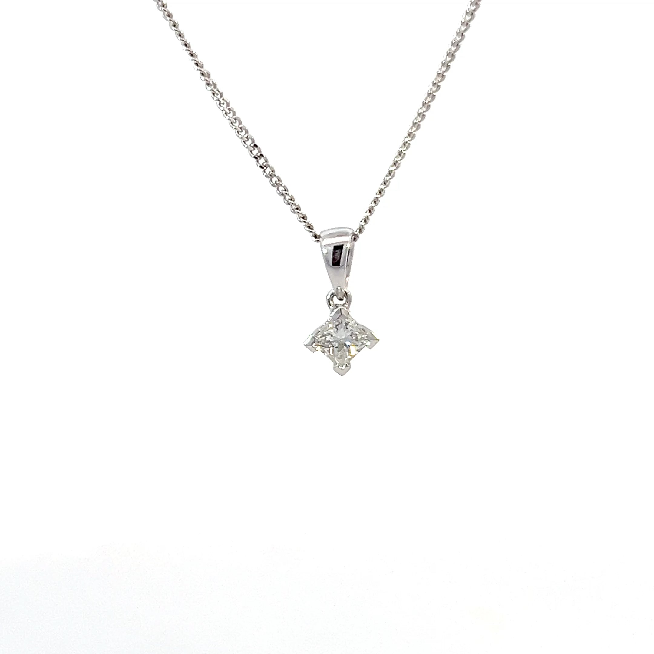 Elevate your jewellery collection with this exquisite 18ct white gold pendant, featuring a stunning 0.25ct princess cut diamond of exceptional quality. The brilliant E colour grade ensures a pure, colourless sparkle, while the VS1 clarity rating guarantees eye-clean brilliance with minimal inclusions. The classic solitaire setting showcases the diamond's geometric precision and radiant light performance, making it an ideal choice for everyday elegance or special occasions. This timeless piece combines sophisticated design with investment-grade gemstone quality, offering a versatile accessory that complements any style. Perfect as a meaningful gift or a personal treasure, this pendant delivers enduring beauty and lasting value.