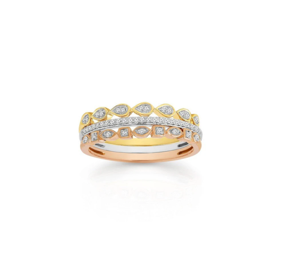 9K 3Tone Gold Pear Triple Dress Ring TDW 0.12ct
