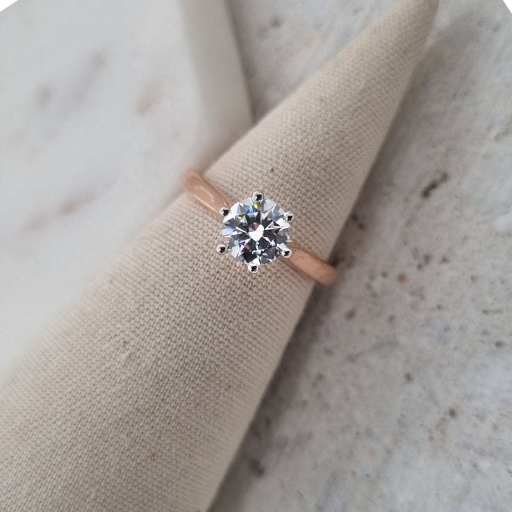 9ct Rose & White Gold Moissanite Brilliant Solitaire.