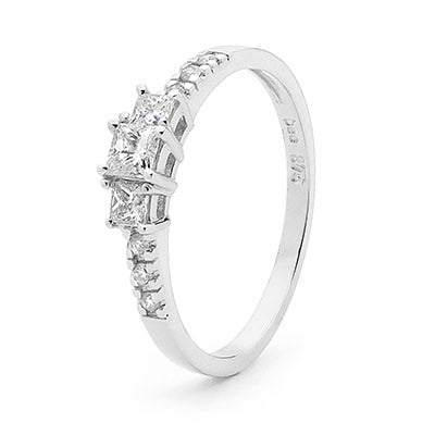 The "Rachel" engagement ring, fit for Royalty, crafted from precious gold and set with three stunning princess cut Diamonds and six brilliant shoulder stones. This ring will look absolutely gorgeous on any finger. Stock size P. W25401