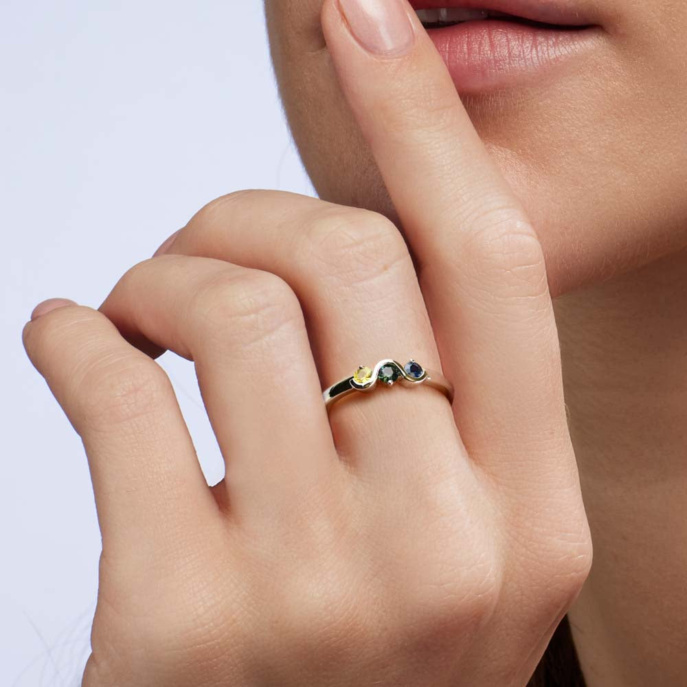 The beautiful Allyra ring is Chic and stylish, featuring three exquisite round cut Australian Sapphires, it can be worn by itself for a subtle everyday pop of colour, or stacked with our other pieces, crafted in 9ct Rose, White or Yellow Gold.