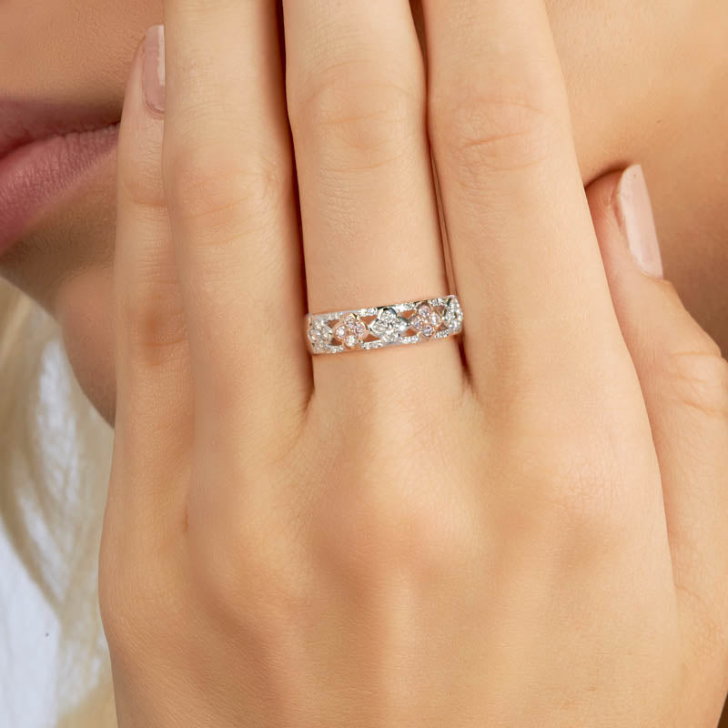 A diamond embellished band design, the Blush Letitia ring features fancy light pink diamonds crafted into 18ct Rose Gold flowers, nestled between white diamond flowers.