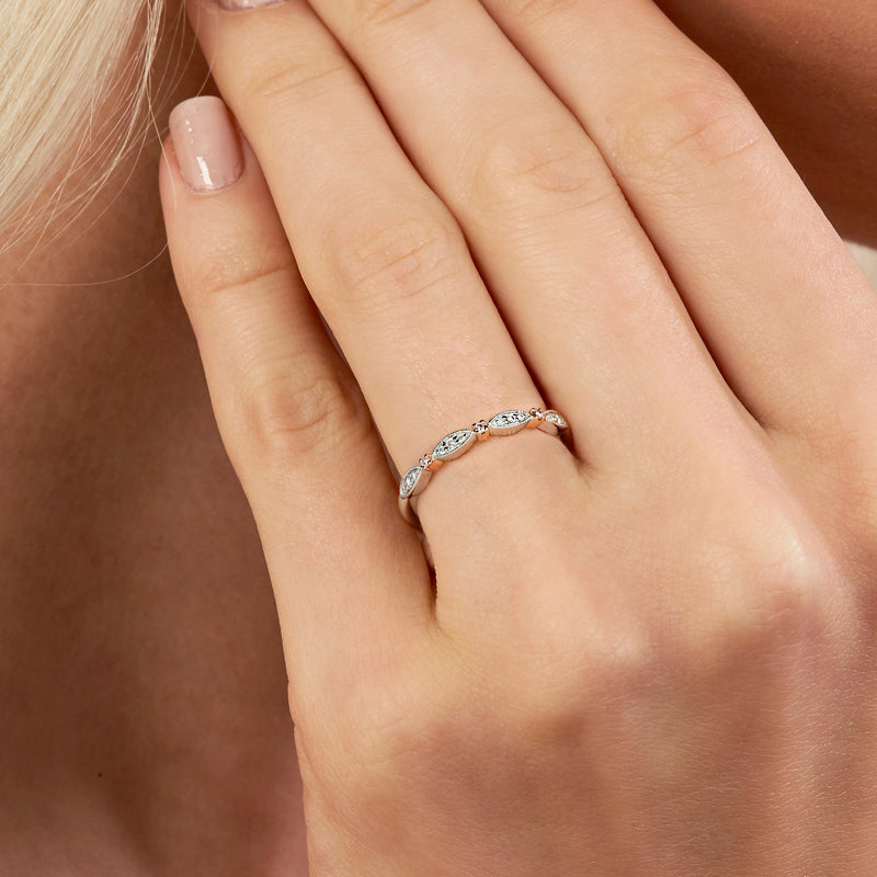 Sweet and feminine, the Scintilla pink diamond stacker ring showcases an array of fancy light pink and white diamonds, set in a slim band design. This piece is crafted in 18ct rose and white gold.